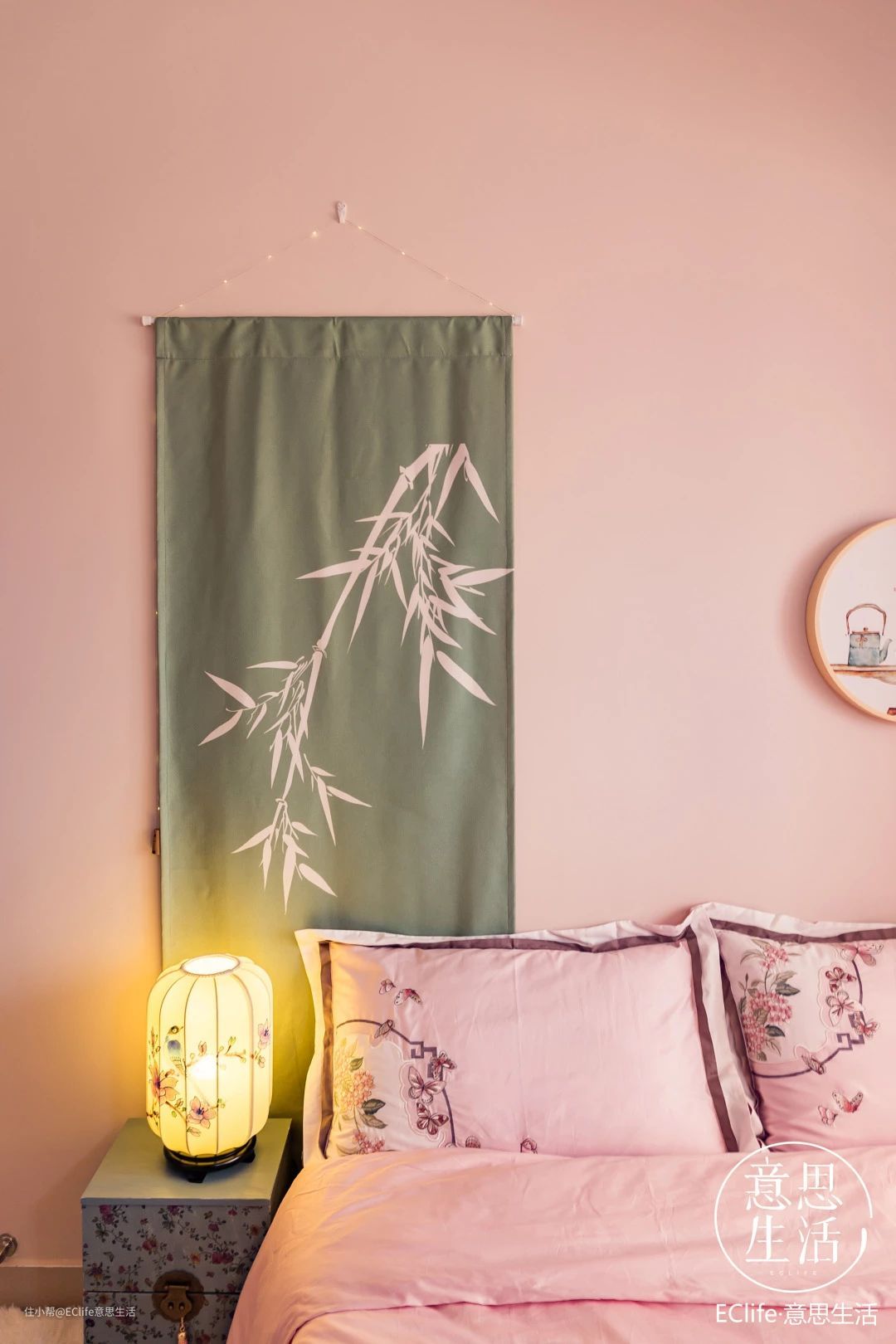 竹子图案的挂布不仅填补了床头背景墙的空白,还为房间整体添了韵味。用电池小灯串来替代挂线,晚上开灯之后超有氛围哟