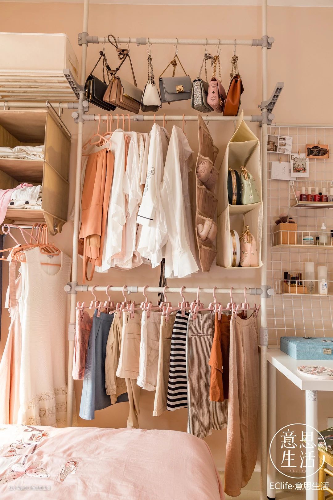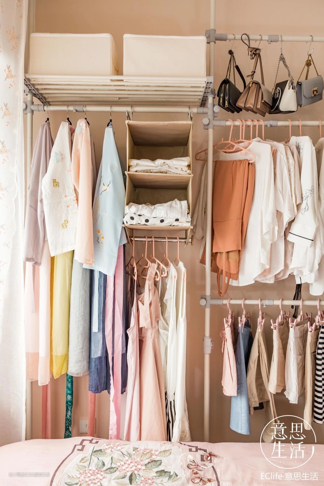 中间放常穿的日常衣物和包包,地上还能放一些鞋子