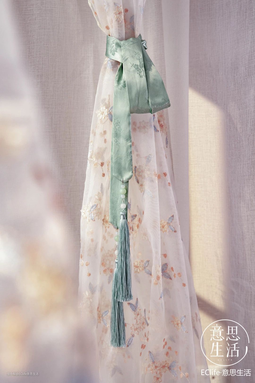 用绸带作为网纱绑带,想晒太阳的时候,系起纱帘来放在飘窗两侧,长长的流苏让空间更有飘逸感