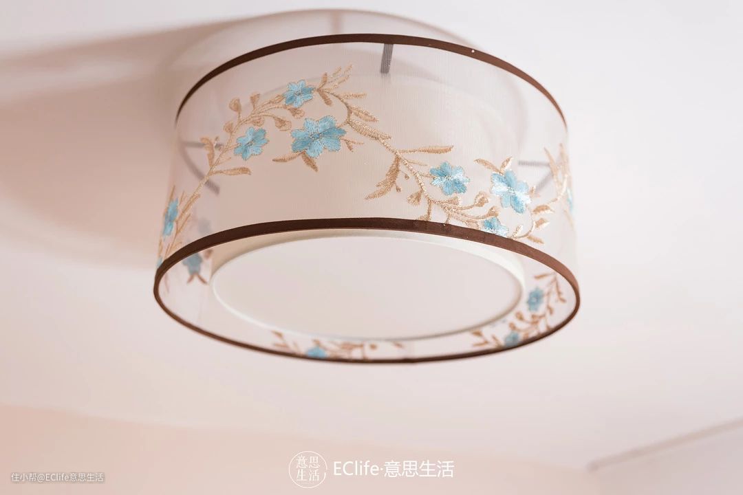 这次特地挑了满月形的白亚麻布顶灯,外层还笼着一层透明黄纱,打开灯,宛如夏日的月光一样朦胧浪漫