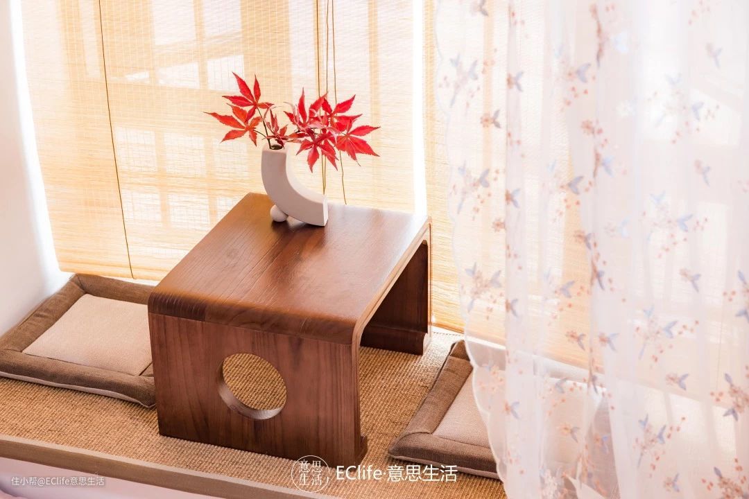 飘窗区是小文的小确幸角落,放置一个木案几,平时可以在这里看书、饮茶