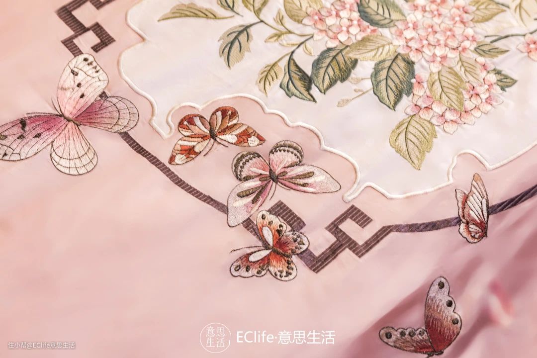 文静的樱粉色特别适合小文的性格,还有舒压助眠的效果,上面蝶恋花和窗棂的刺绣透露着精致感