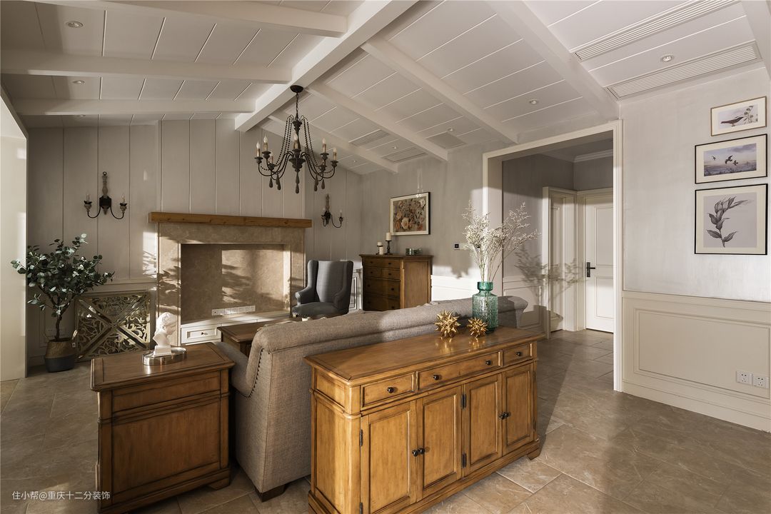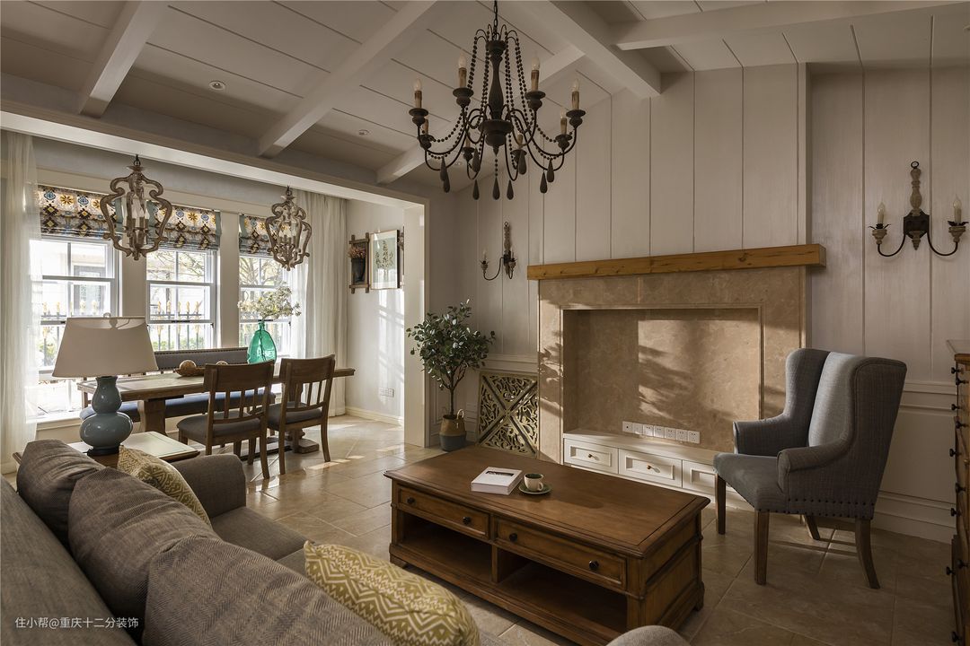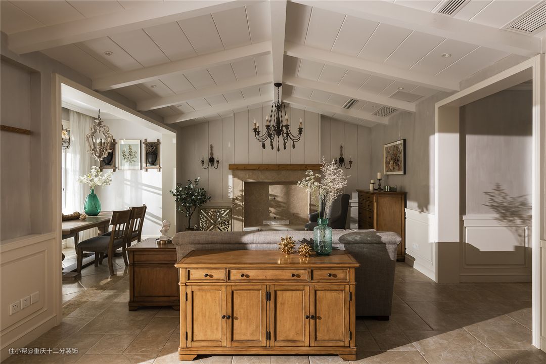 客厅顶面根据风格空间高的特点做成坡顶结构,在功能和视觉上都得到了满足。整体空间提升拉高,护墙板工艺精湛,独具匠心。