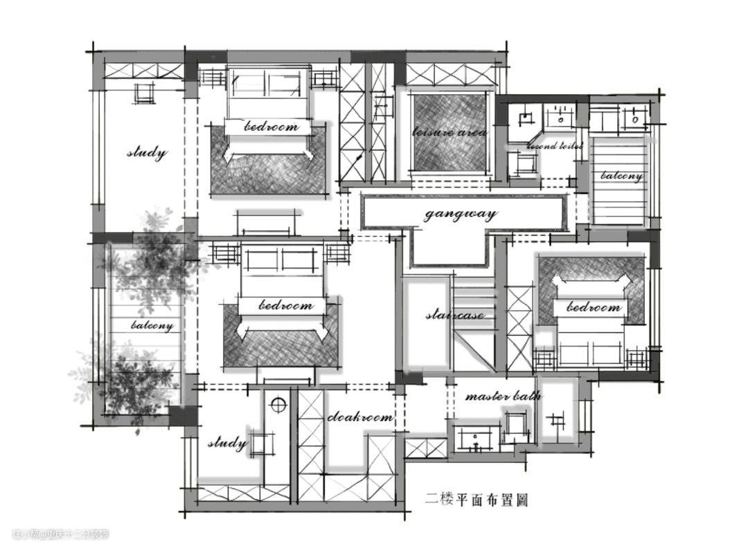二楼是屋主和孩子的生活区域,上楼的位置坐了一个休闲区,方便屋主和孩子的互动 也能让过道显得不拥挤,大气;主卧配置了书房和衣帽间,二楼还设置了屋主自己使用的偏私密的生活阳台。