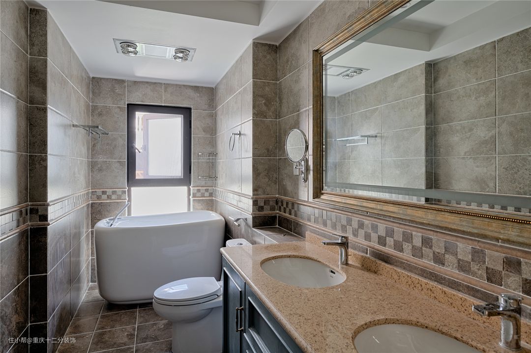 主卧卫生间,其实不大,但是很长,很深,做了双盆,早上不用再抢着用镜子,镜面很大,周围带了一圈灯带,照出来人美心善,哈哈哈……还另外安了个化妆镜,非常方便。所有的五金挂件都是天猫上买的,全铜镀络的,质量非常可以,当然也不便宜。。