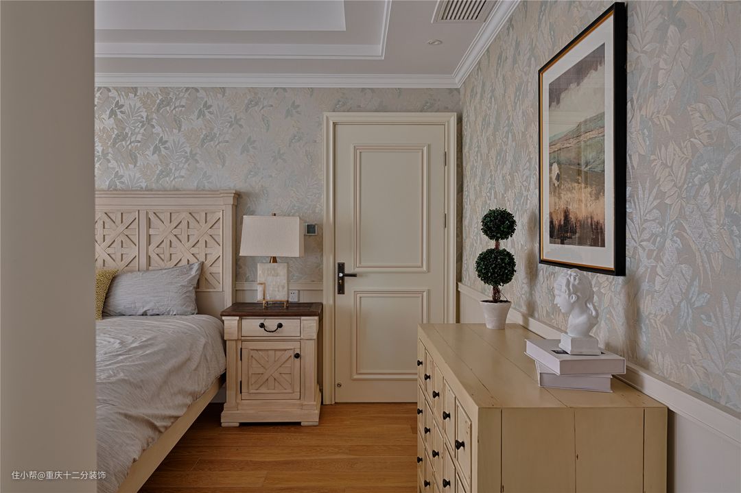 主卧空间,护墙板和清新淡然的墙纸,搭配奶茶色的家具与软饰,优雅中自显生机活力。卸下一身疲惫,泡个解压澡,十分惬意。