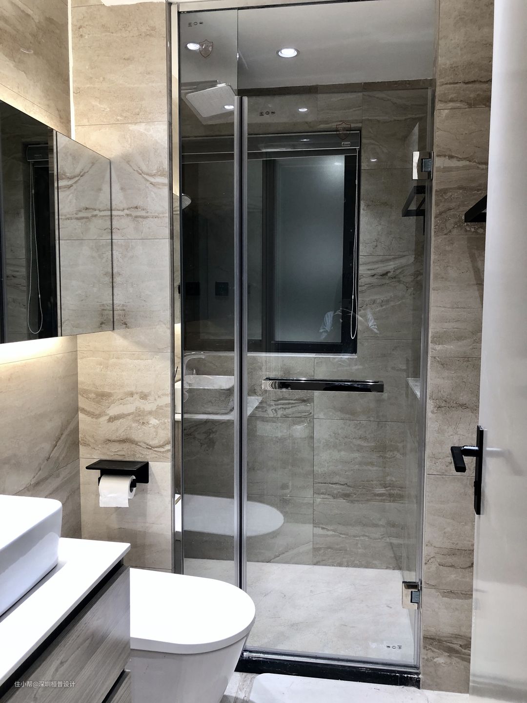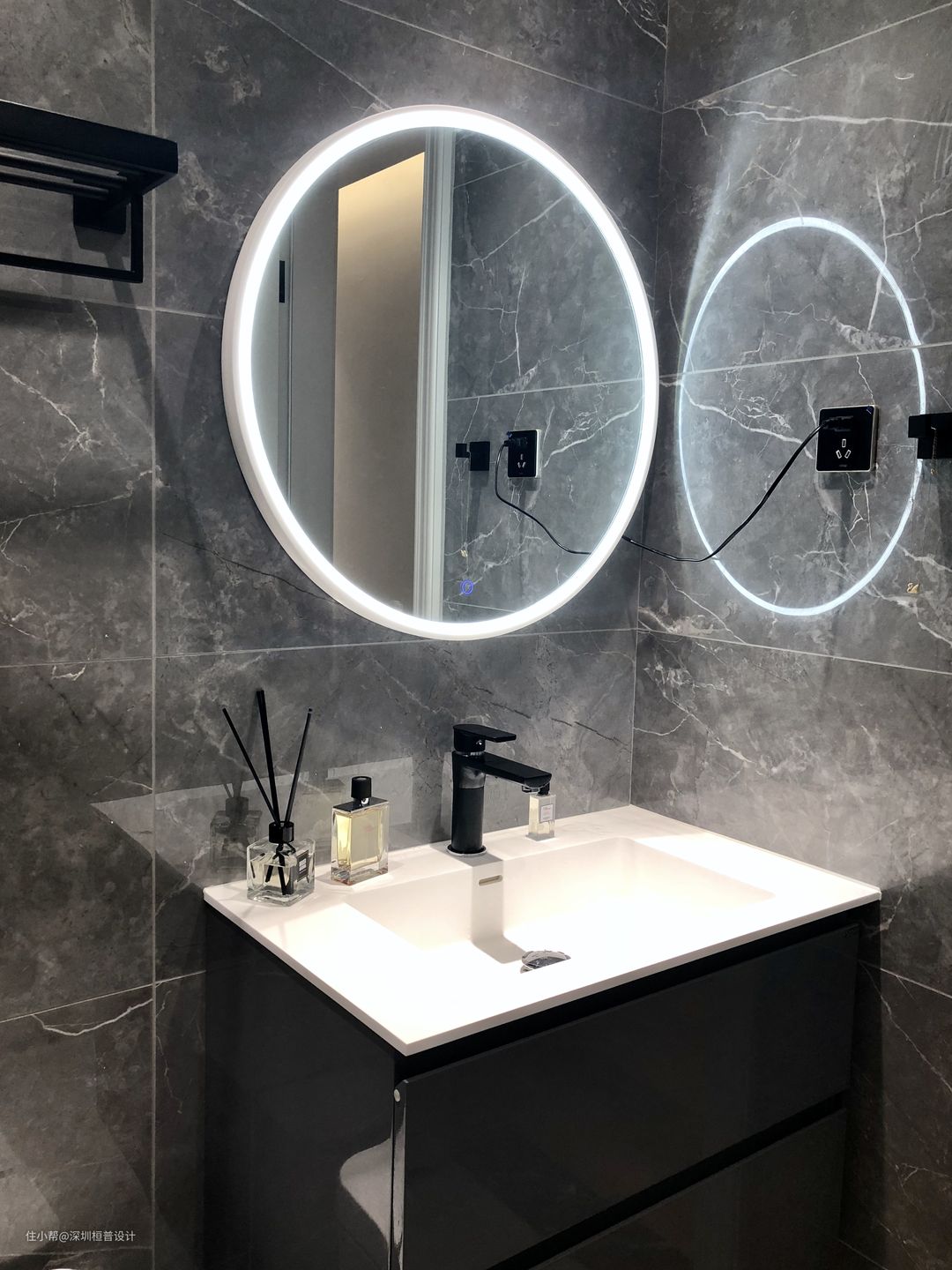 公卫因光线不足所以用了浅色的砖,提升空间整体亮度。主卫而是延用了黑白灰经典配色,简约且高级感。
