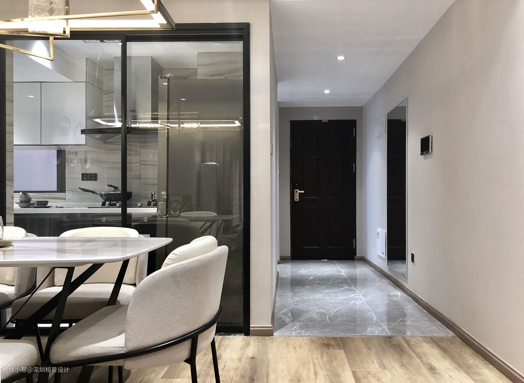 玄关中不管是浅灰色地砖和墙面大白柜,都能很好的融入现代简约风格里。#简约风 。