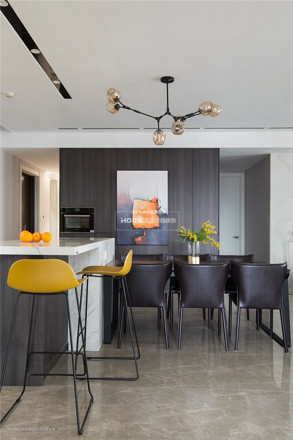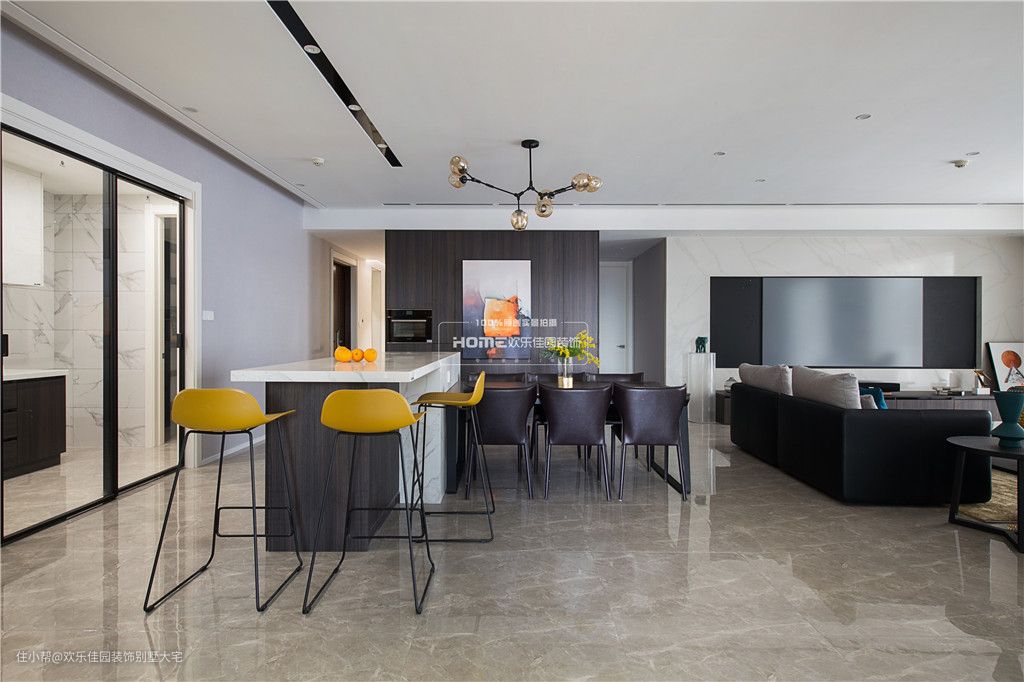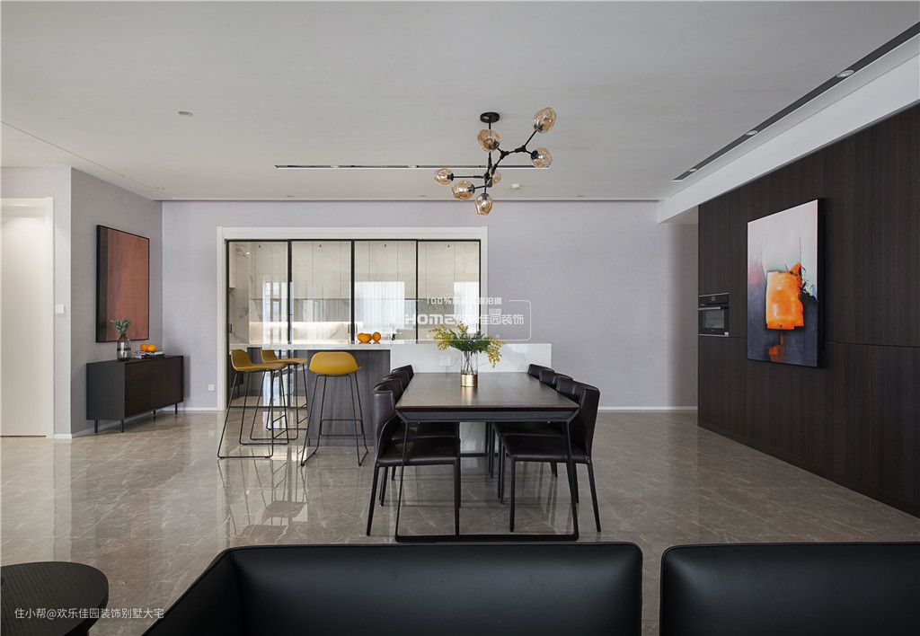 餐厅2.8m的大岛台跟餐桌结合起来,用高柜把管道井包起来,深色质感的柜体颜色,搭配上橘黄色的抽象挂画,让整个空间逼格十足。