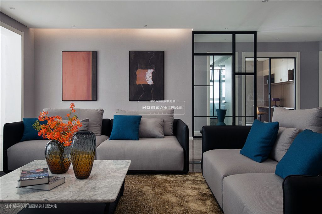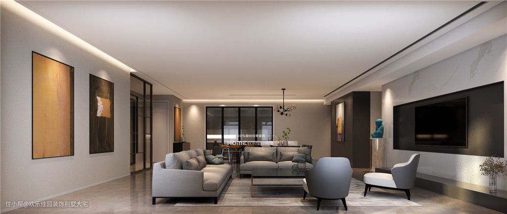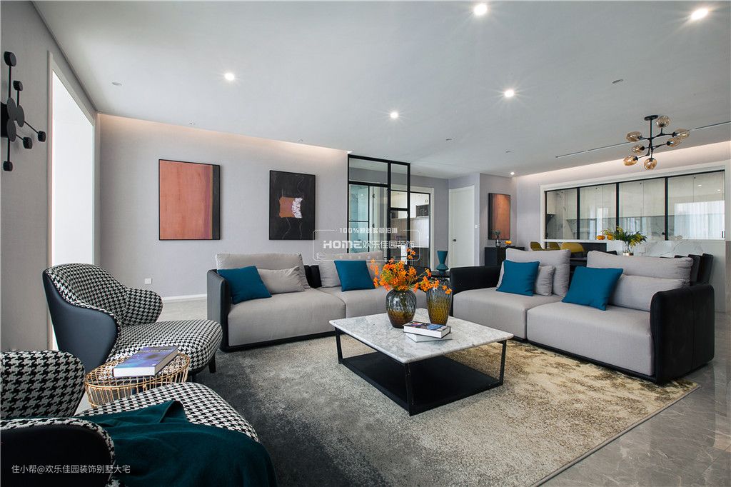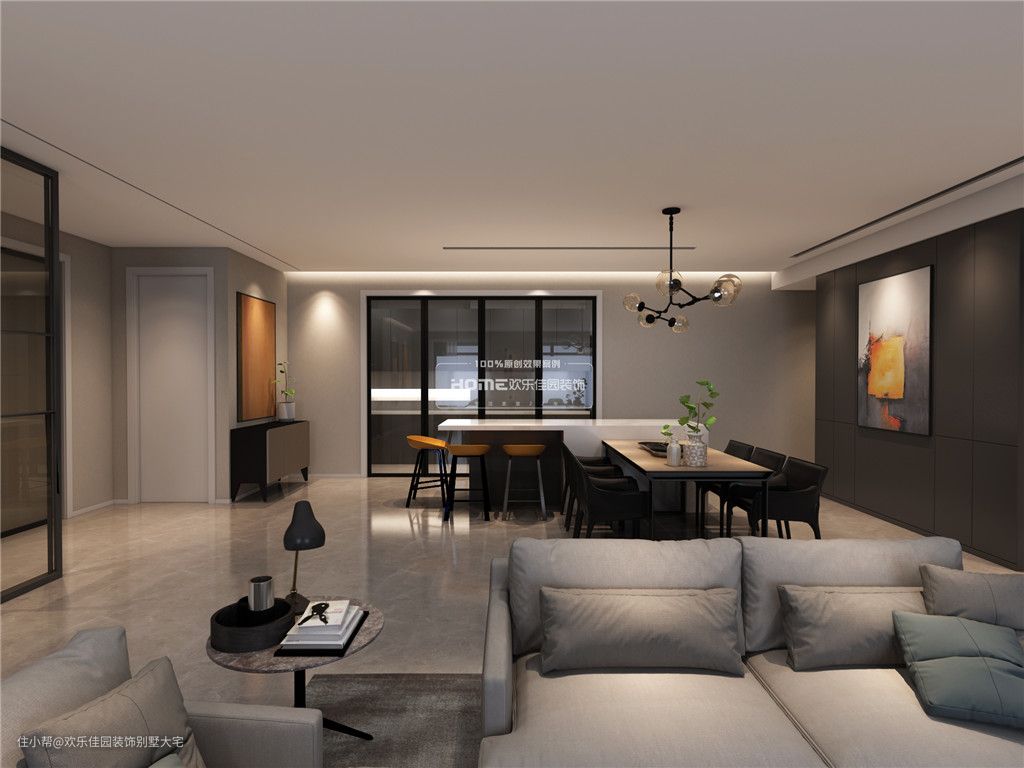 因前一套房子所有的硬装和软装都是业主自己弄的,做出来的效果很不理想。为了保证效果,在做效果图之前,我们花了很多心思去挑选软装,沙发餐桌到吊灯挂画,全部淘好做到效果图里面,效果图呈现后我们都很满意,没有再调整过。