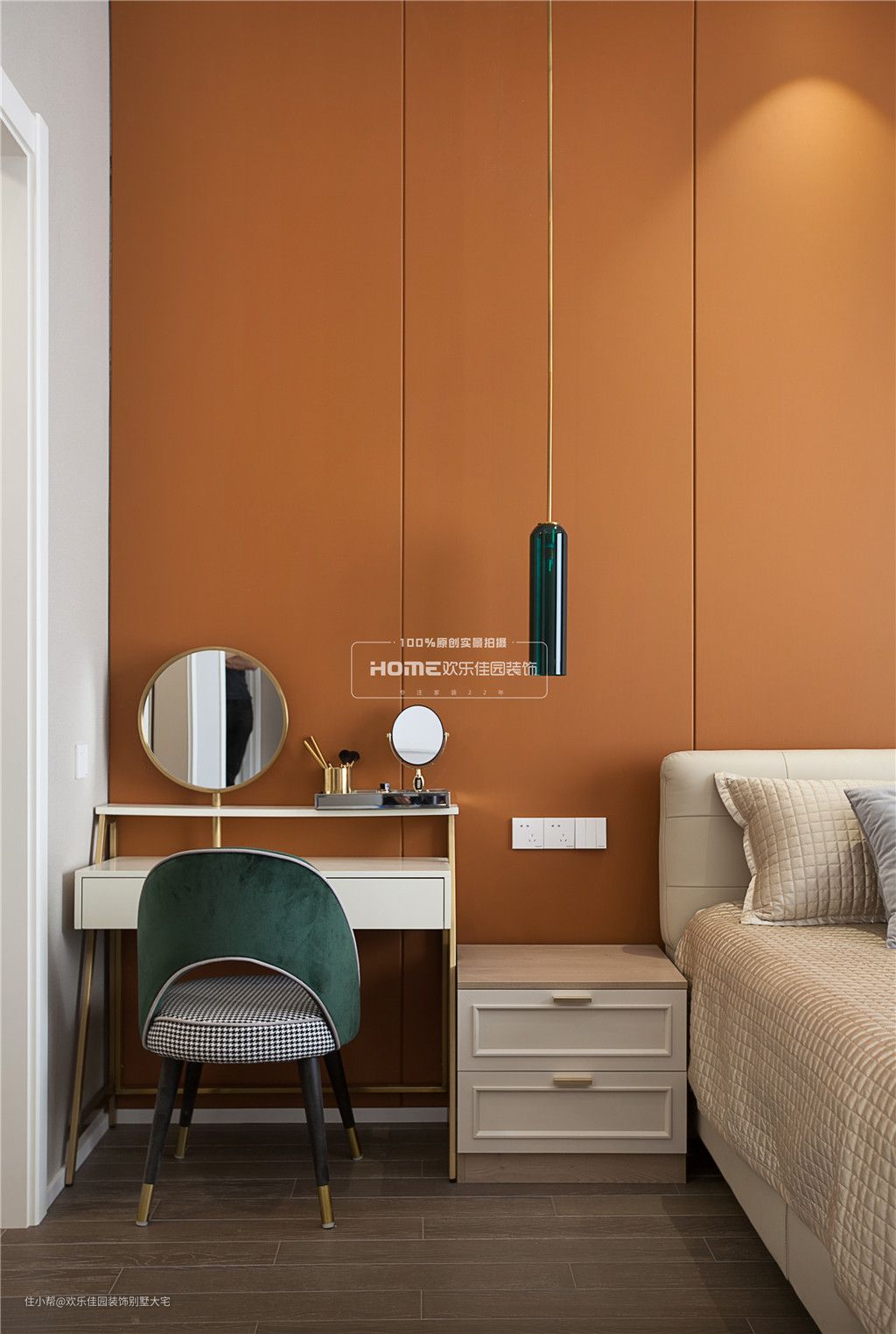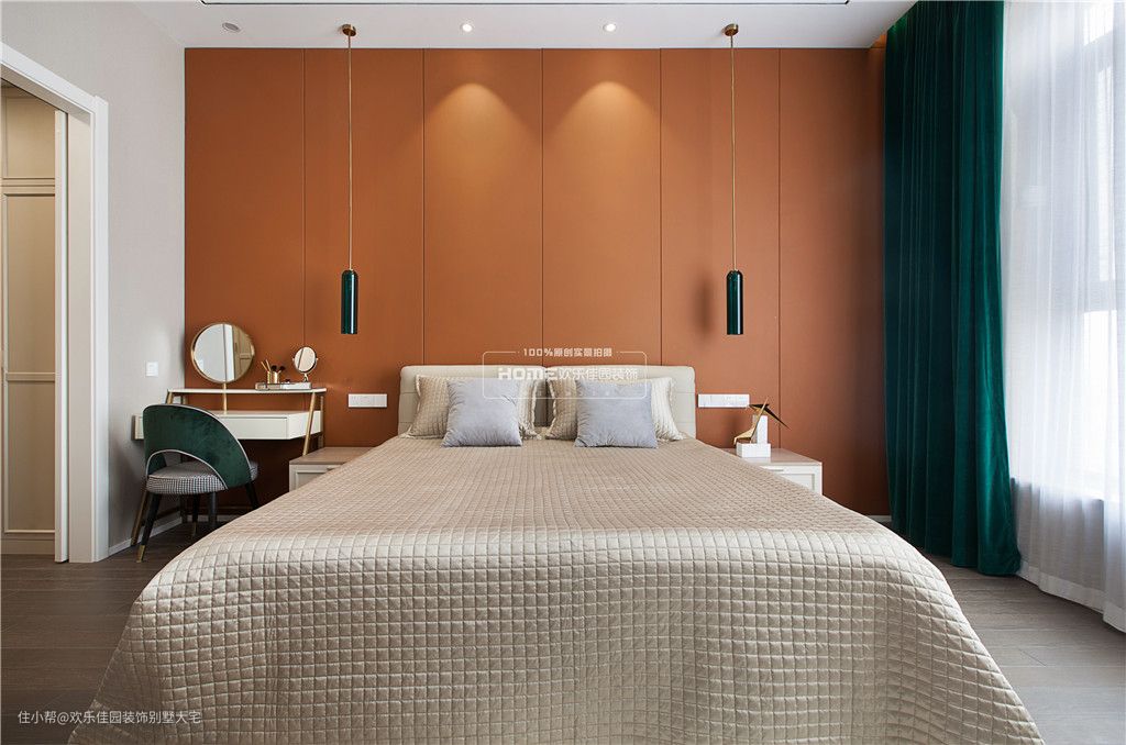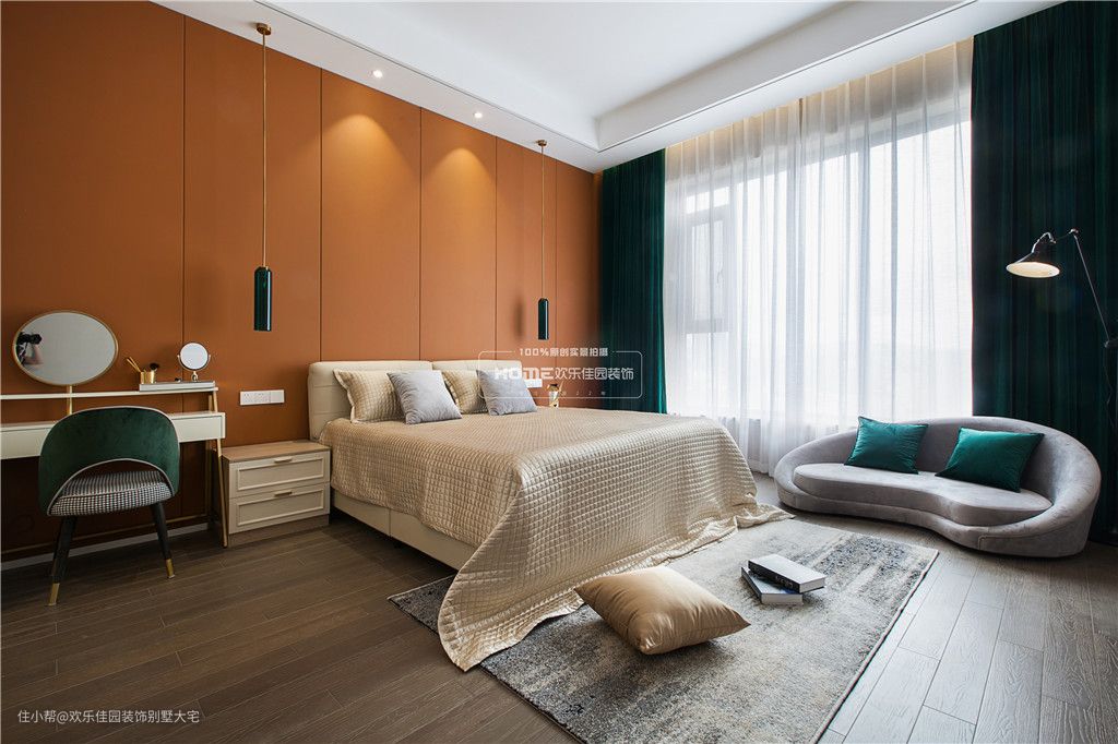主卧室深咖色的木地板、米灰色的墙纸,让疲惫的身心在回到卧室的那一刻瞬间放松了下来;爱马仕橙的床头背景,搭配孔雀绿的窗帘,撞色的处理,并没有让人产生烦躁的感觉,反而让空间显得趣味性十足。