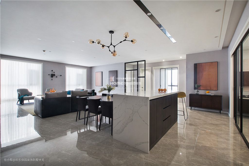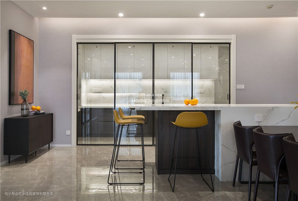 岛台的石材与木、铁艺吧椅、皮质餐椅,不同的材质在不同家具上展现着独有质感。