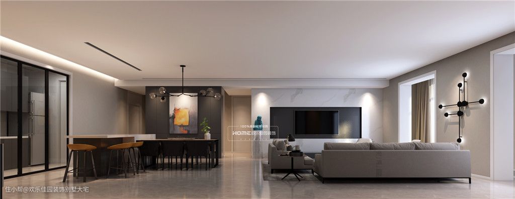 客厅到餐厅的空间造型简洁,大开间空间设计大气开阔,顶面没有梁体的分割,以平顶处理,局部点缀黑钛拉丝不锈钢,干净利落。