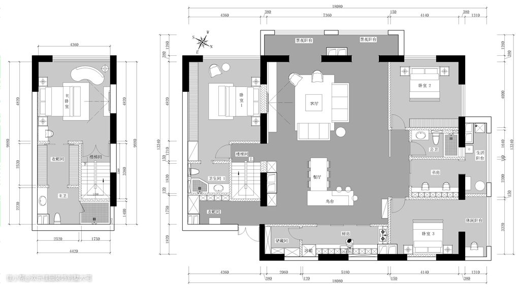 两位业主性格都比较直爽,表达想法也比较直接,不需要我花太多的时间去揣摩他们的心思和喜好,沟通和相处都比较愉悦。第一次沟通中,了解到房子是大平层,进门是挑高空间。希望在功能设计上体现大平层的气势和空间感,要给两个儿子足够的学习玩耍空间,把客餐厅空间留得足够大。设计风格上明确表示很喜欢黑白灰的感觉,注重软装搭配效果。