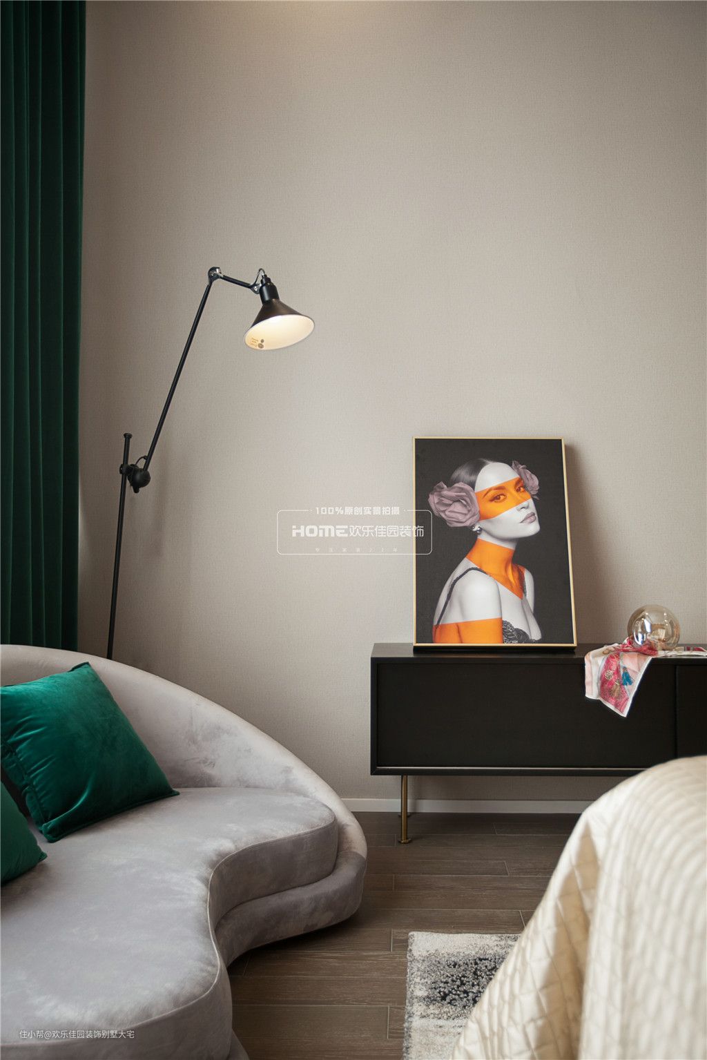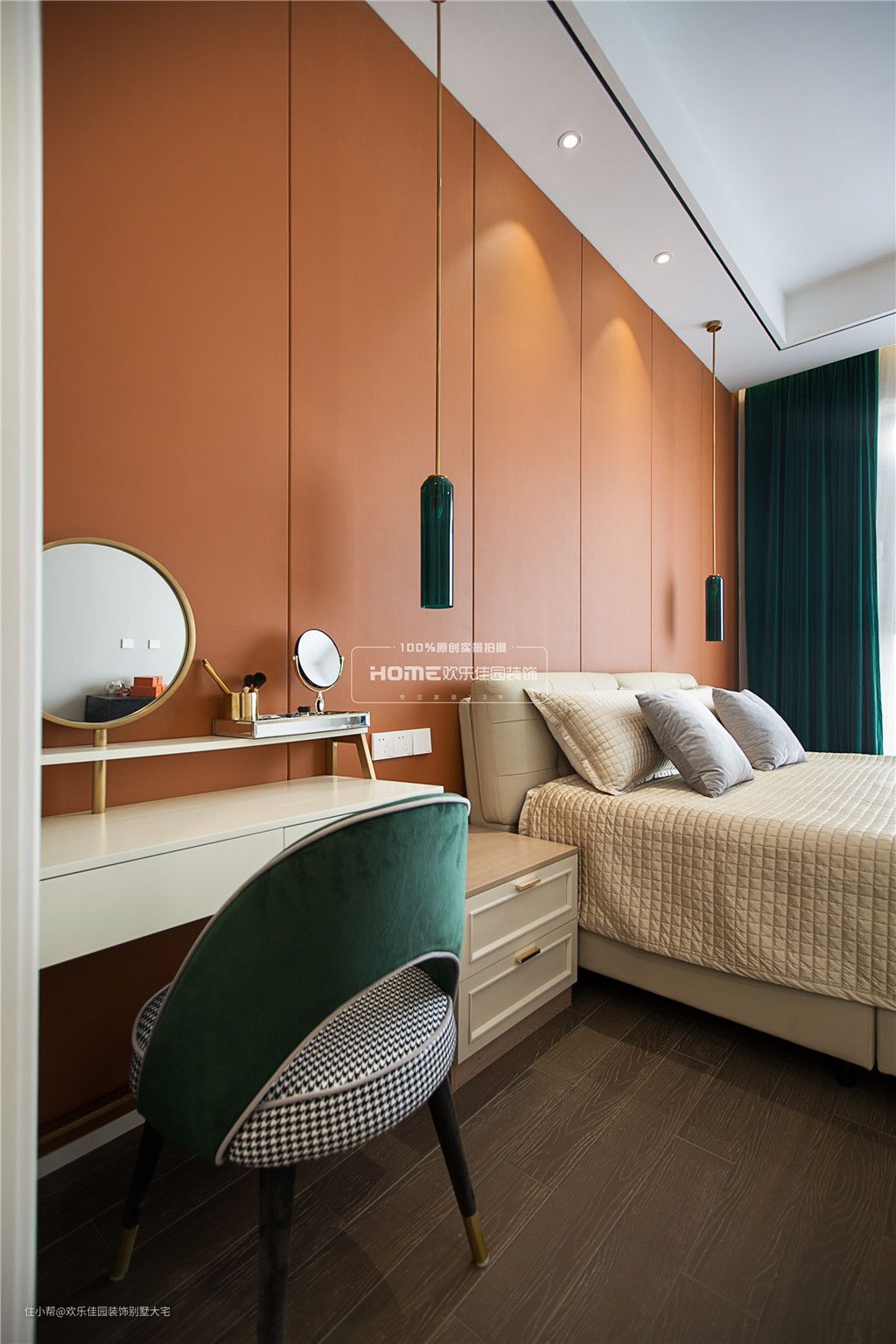 主卧室深咖色的木地板、米灰色的墙纸,让疲惫的身心在回到卧室的那一刻瞬间放松了下来;爱马仕橙的床头背景,搭配孔雀绿的窗帘,撞色的处理,并没有让人产生烦躁的感觉,反而让空间显得趣味性十足。