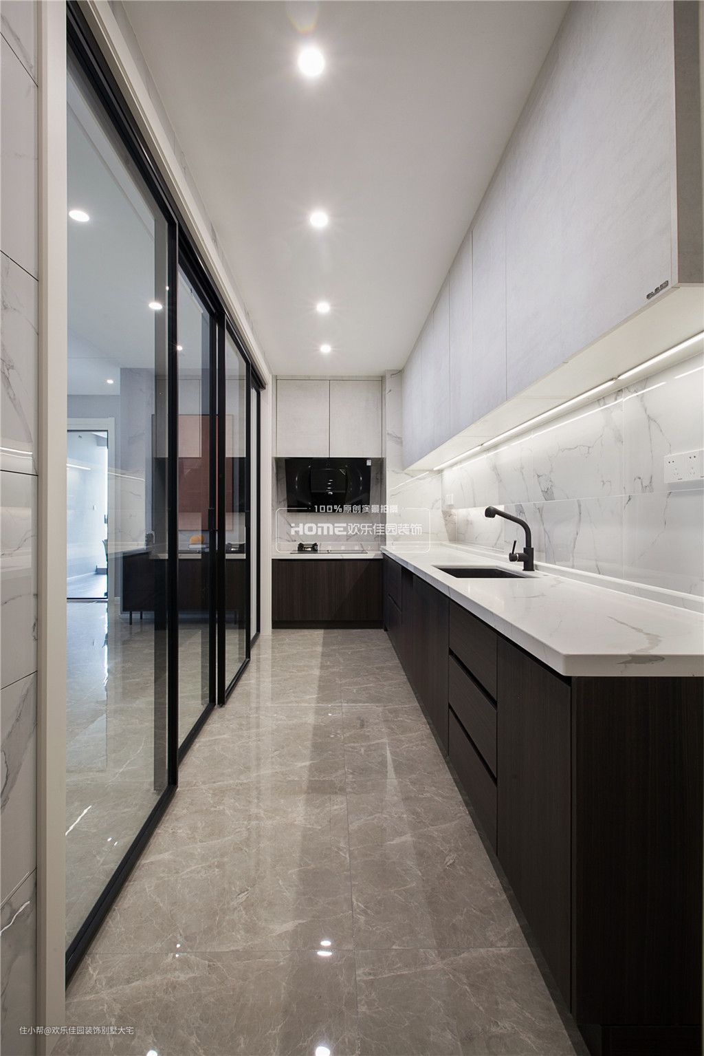 厨房地柜延续高柜及吧台柜体的颜色,吊柜采用浅水泥灰的颜色,整个空间干净利落,更协调统一。
