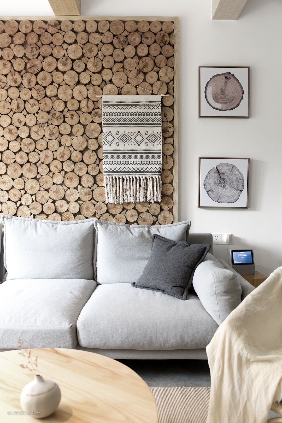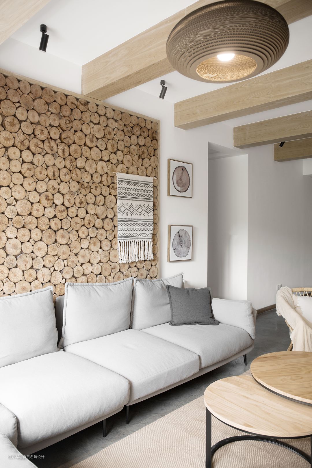 沙发背景墙原木桩分段,搭配水泥质感的地面,增添空间的自然休闲气息。