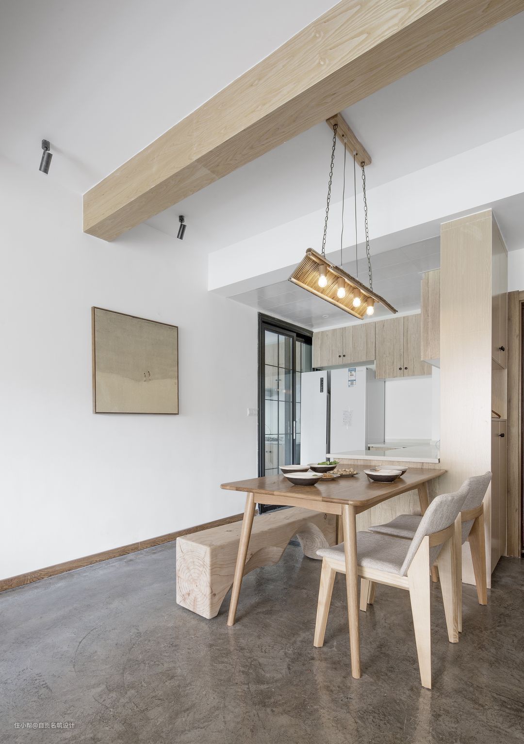 原木质感的餐桌椅,搭配一个木头长凳,顶上一排独特造型吊灯,整体用餐氛围显得自然而惬意舒适。