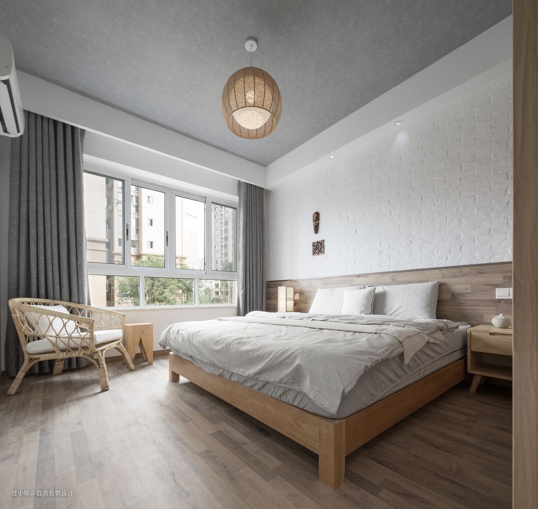 卧室大胆的灰色天花,挂一盏简约自然的吊灯,搭配一张休闲藤椅,让空间呈现出一种简约舒适的氛围感。