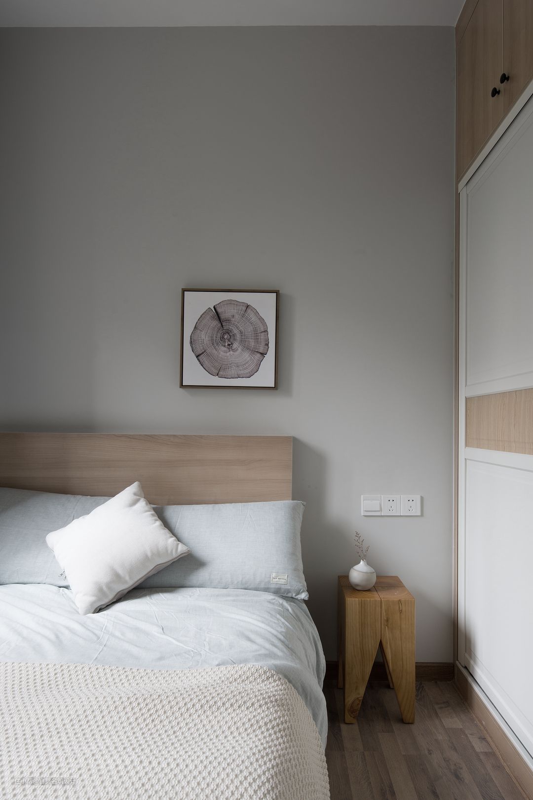 床头背景选用优雅的灰色调,挂一副年轮装饰画,静谧安静。