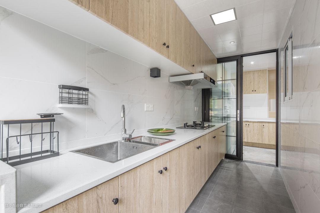 一字型的厨房,灰色地面+雅白墙面,结合木色橱柜吊柜,整体做饭的空间也显得轻松自然。为了厨房墙砖简洁有质感,选用800*800地砖加工成400*800进行一一排版铺贴,白砖纹路自然不呆板,整体搭配起来简洁大气。