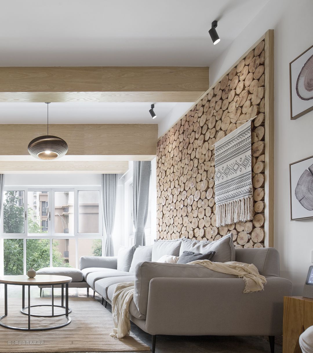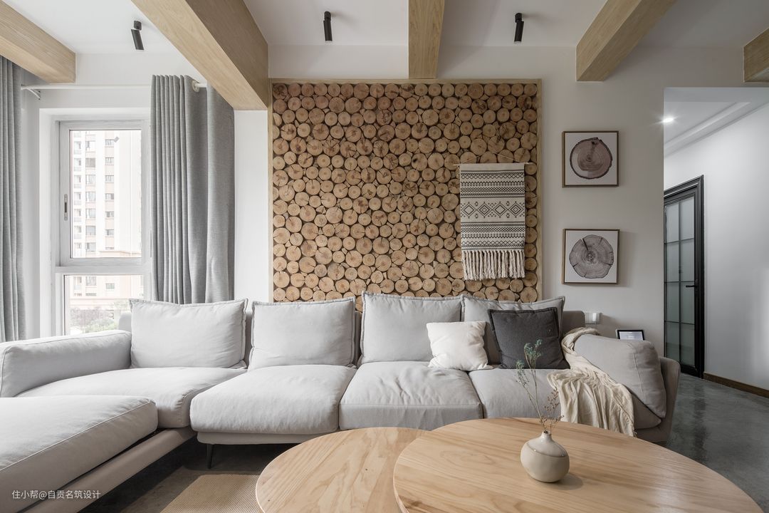 沙发背景墙原木桩分段,搭配水泥质感的地面,增添空间的自然休闲气息。