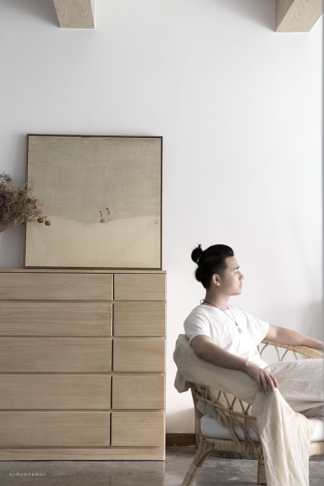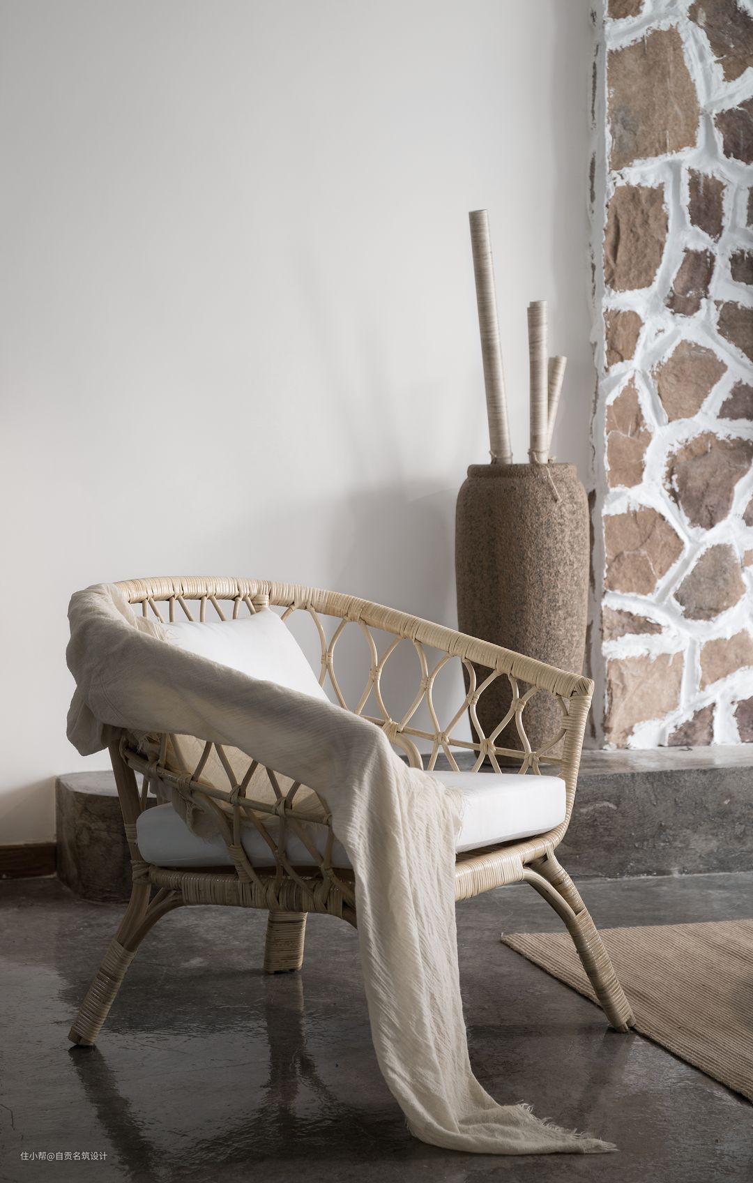 我们通过自然中的石头木头麻布水泥自然中的元素来组合整个空间的设计框架,没有任何的人工色,自然的石色木色水泥和麻布的颜色搭配出了最自然的调性。