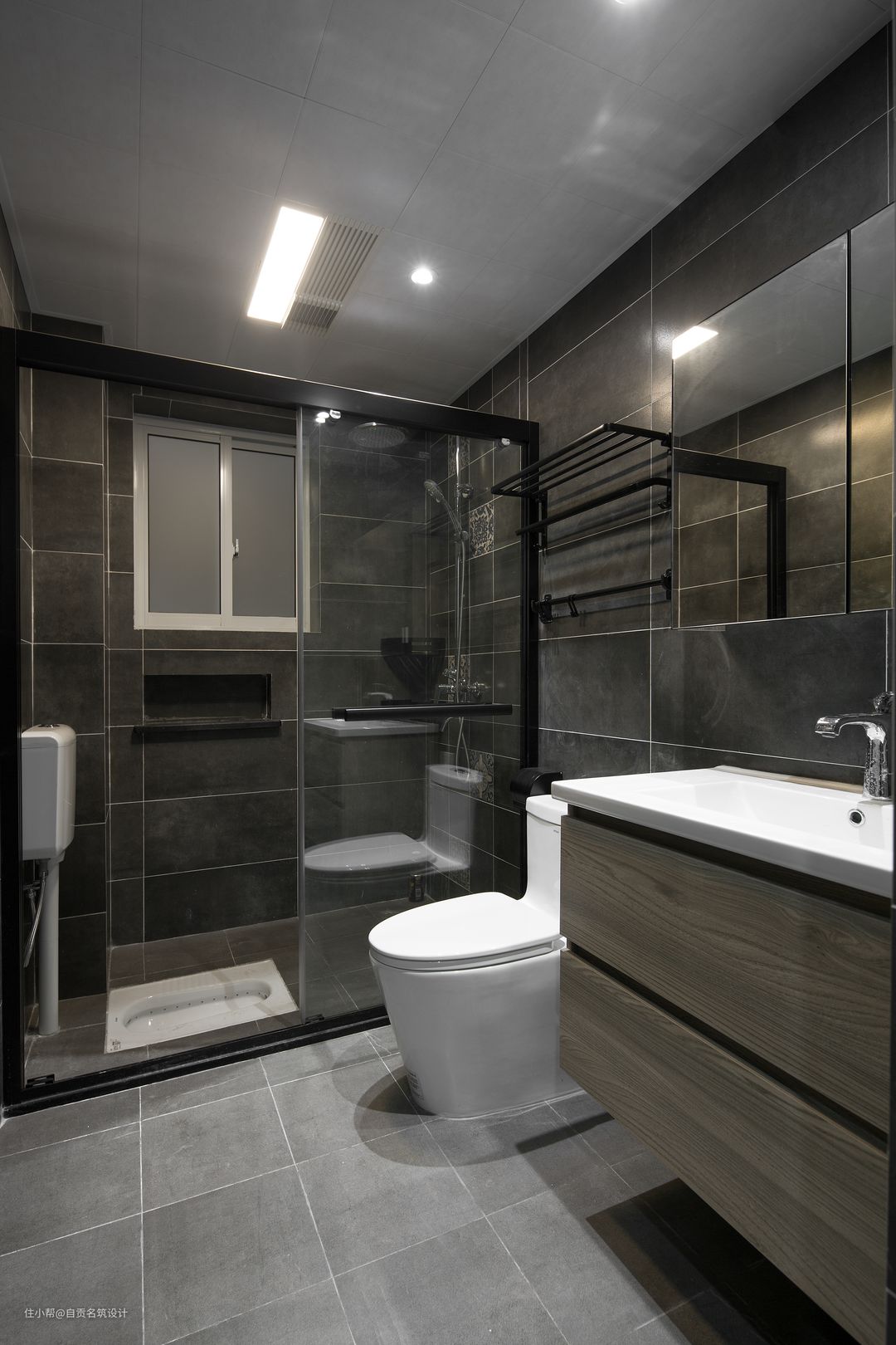 卫生间整体灰色调简约又显高级。镜柜与淋浴房壁坑大大增加了收纳性。不同灰度的墙地砖,体现质感耐脏又便于打理。