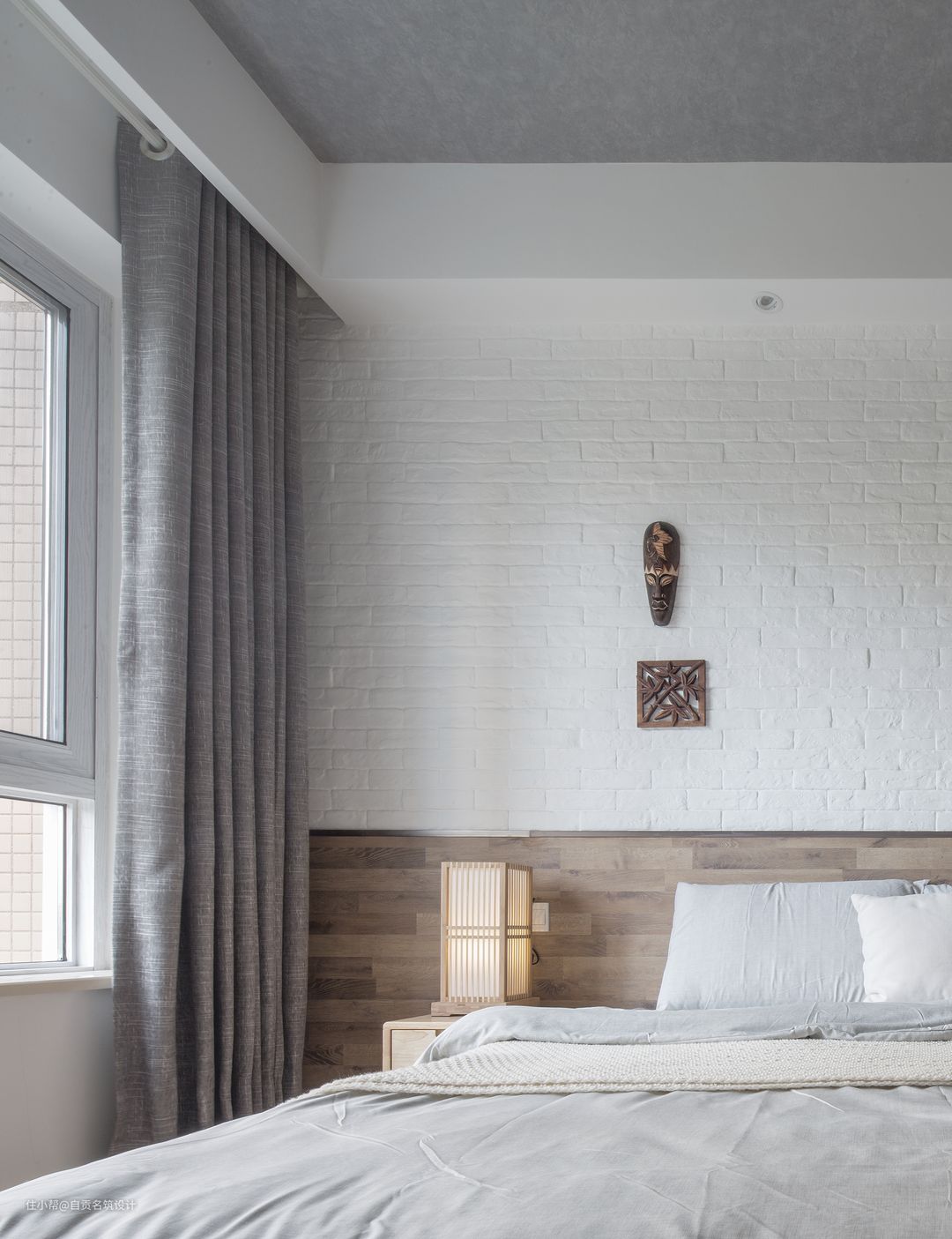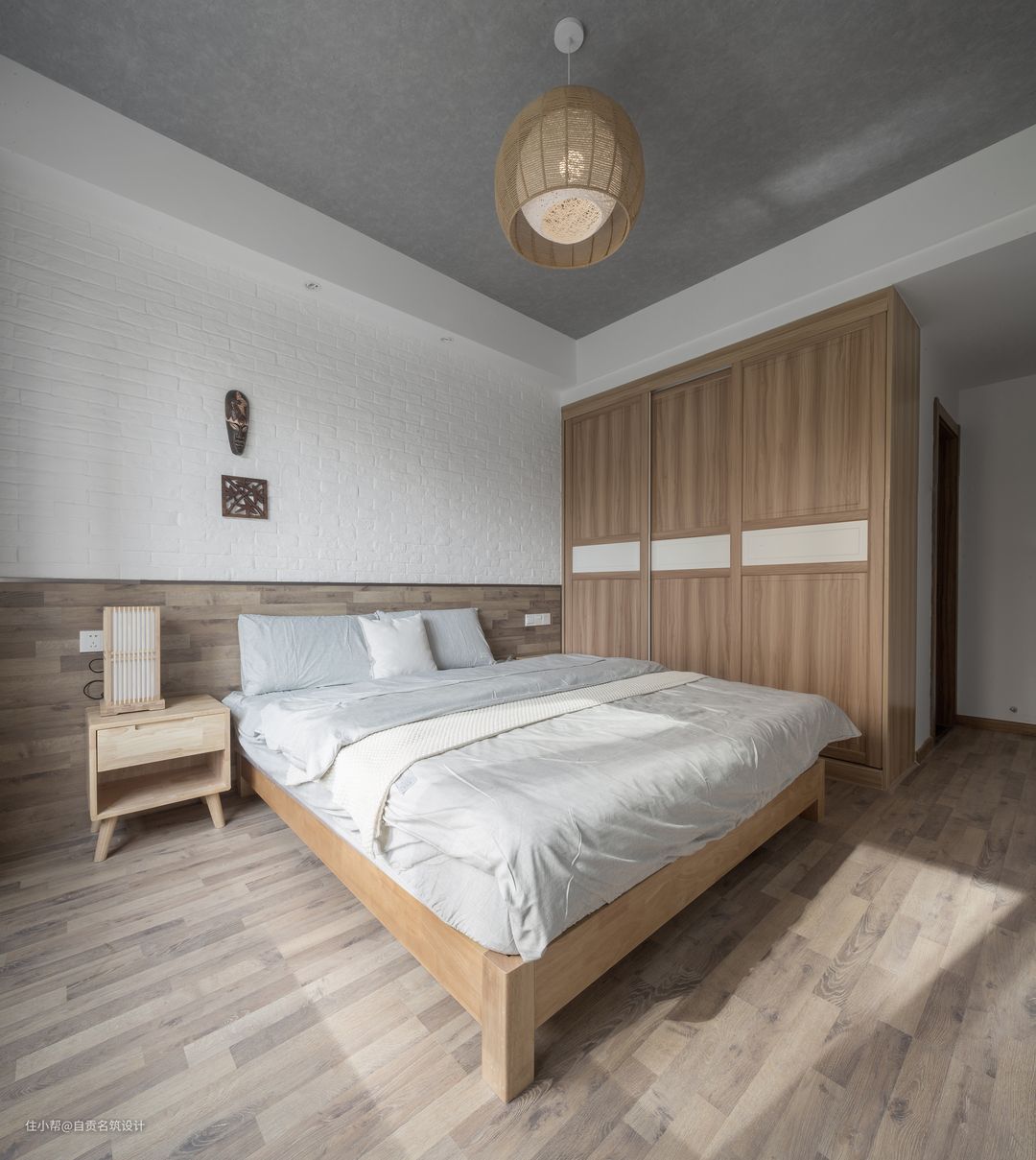 木地板上墙作为床头背景的一部分,增加与地面的延伸性,又打破了大白墙的单调感。