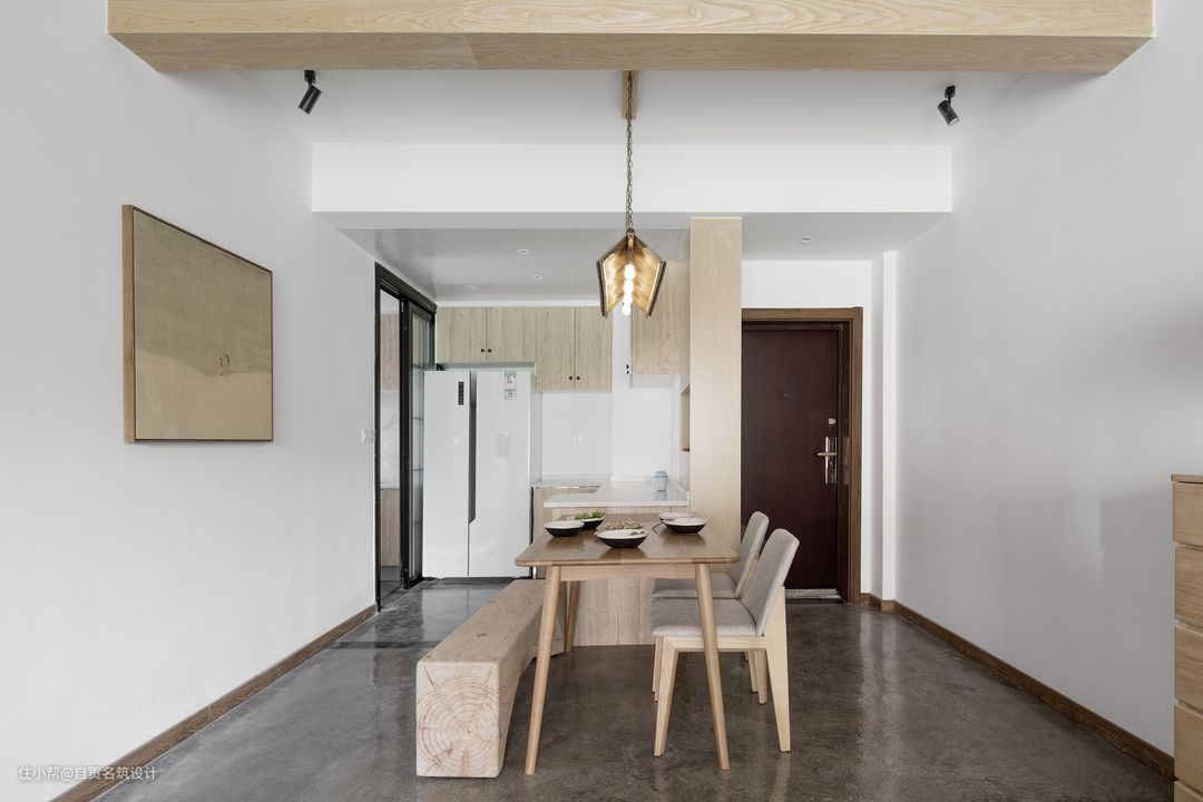 - 客厅阳台横梁用木质面板包裹,客餐厅天花一并假梁装饰,即美化了横梁又让空间显得原始自然。墙顶面白色乳胶漆拉升空间视觉感,让客餐厅不显压抑。