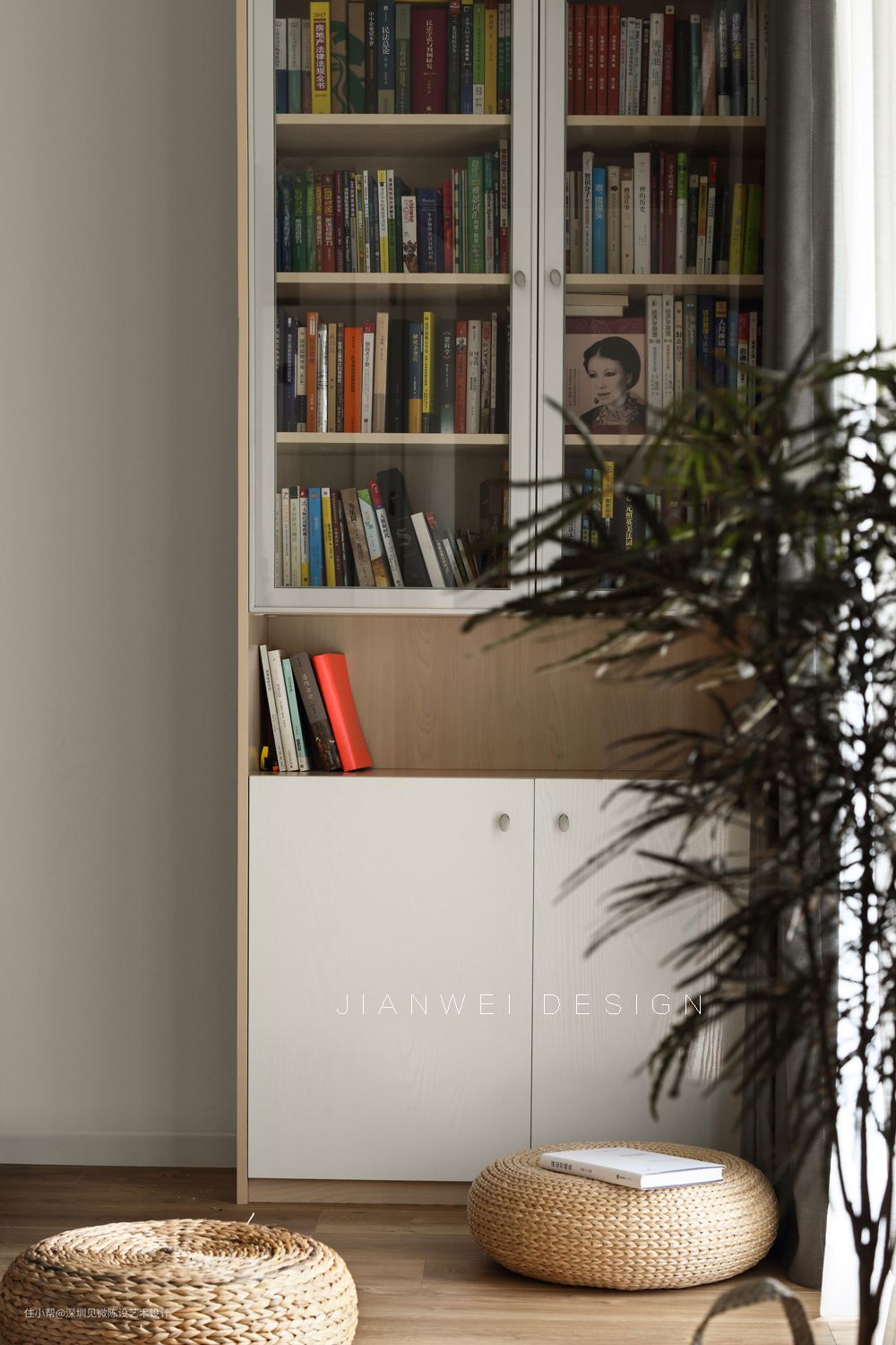 沙发旁特意设计了书架,容量很大,方便拿取。在草编蒲团垫上小坐,喝茶读书,蝉鸣的夏季也能让人心宁。