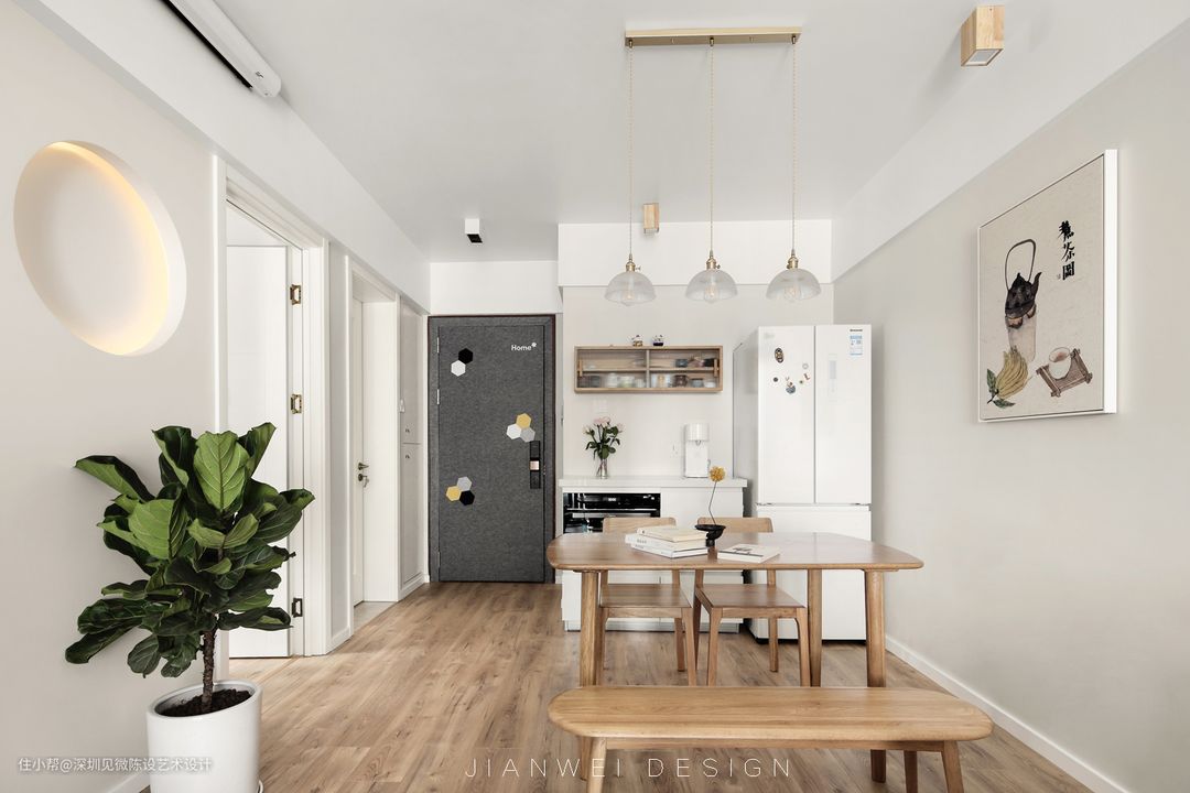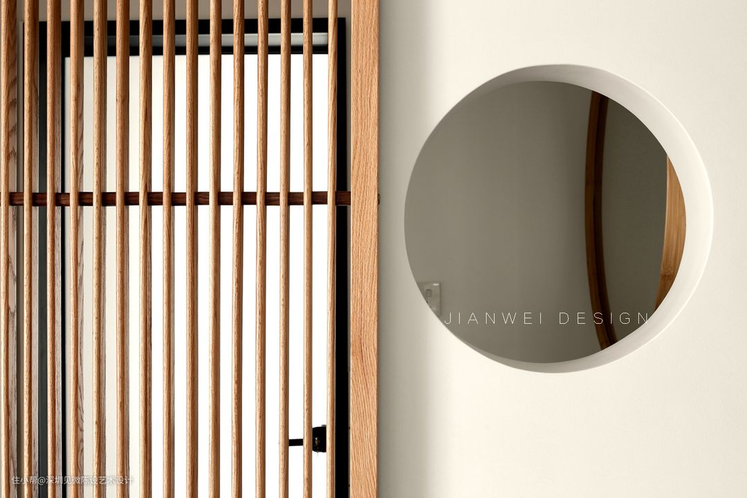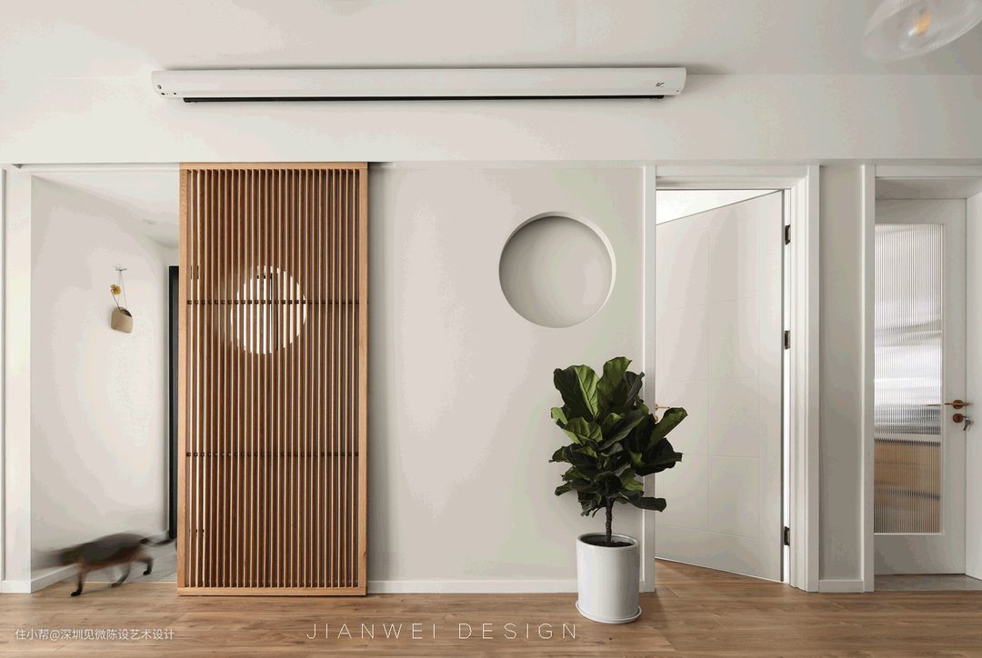 客厅这个可移动的屏风增加空间趣味性,圆形造型设计在平静中给人禅意的感觉,增加空间趣味性,屏风弱化一下客厅门洞过多的视觉差,同时增加干区采光与空间的联动惯性。