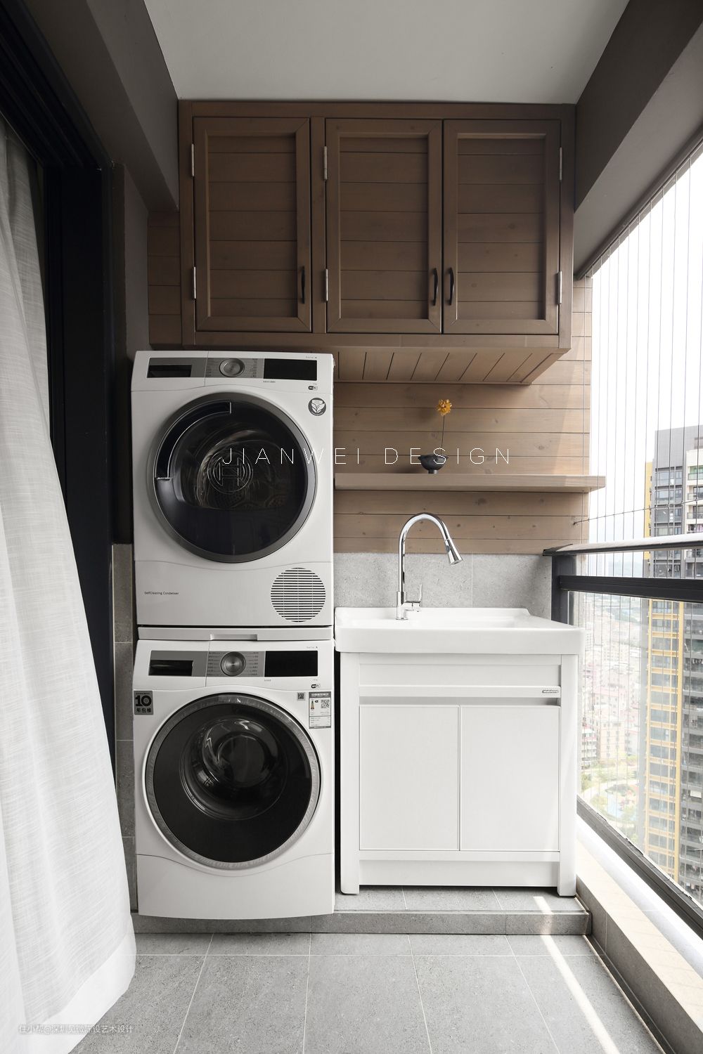 对阳台的改造,除了洗烘衣物,我们还改造出了洗漱区,用户外木做了大容量的收纳吊柜,还将整墙柜的中间部分设计成开放格,摆放洗漱用品,搭配洗手盆,这样的洗漱区还自带风景,有点五星级的feel。