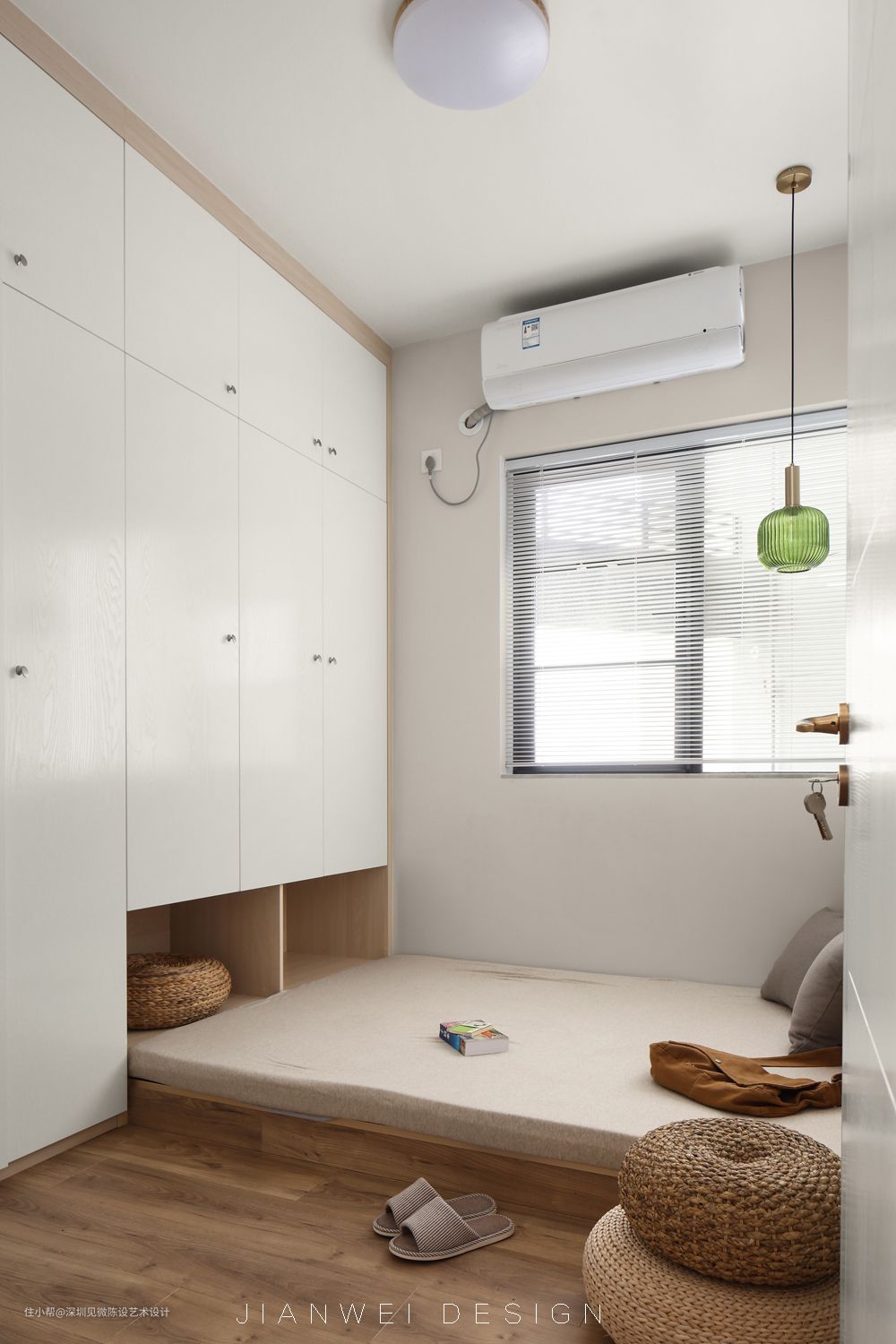 客房延续了日式调性,收纳和居住需求兼顾。做了榻榻米床,或许可以在一个宁静的午后,慵懒得摊在软糯的榻榻米上,发呆,当阳光恰到好处地洒进室内,安谧的氛围弥漫整个空间。照着墙打了一大面柜子,在榻榻米的位置留了两个凹槽,可以临时收纳枕头和薄被。