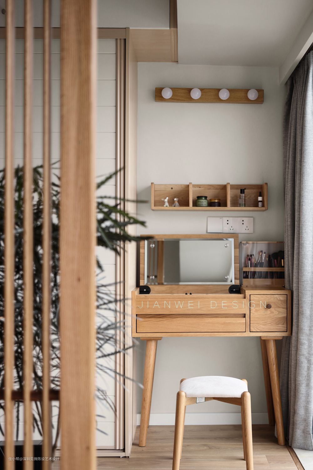 翻板化妆台,避免镜子对着床头,拿取方便。补光灯也是水电阶段设计师就预料安排了的。开放格小层板也是恰到好处的好用(墙裂安利)