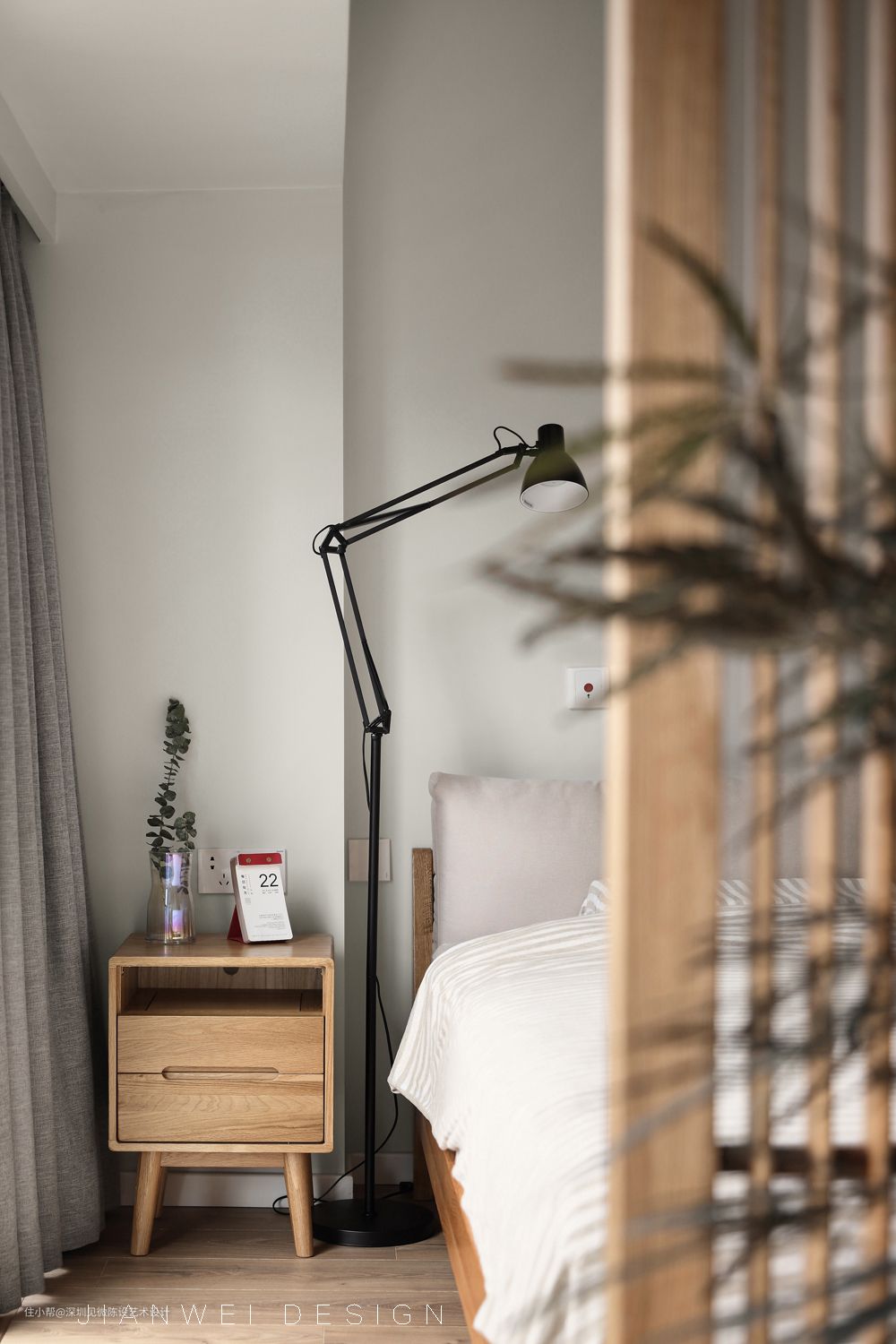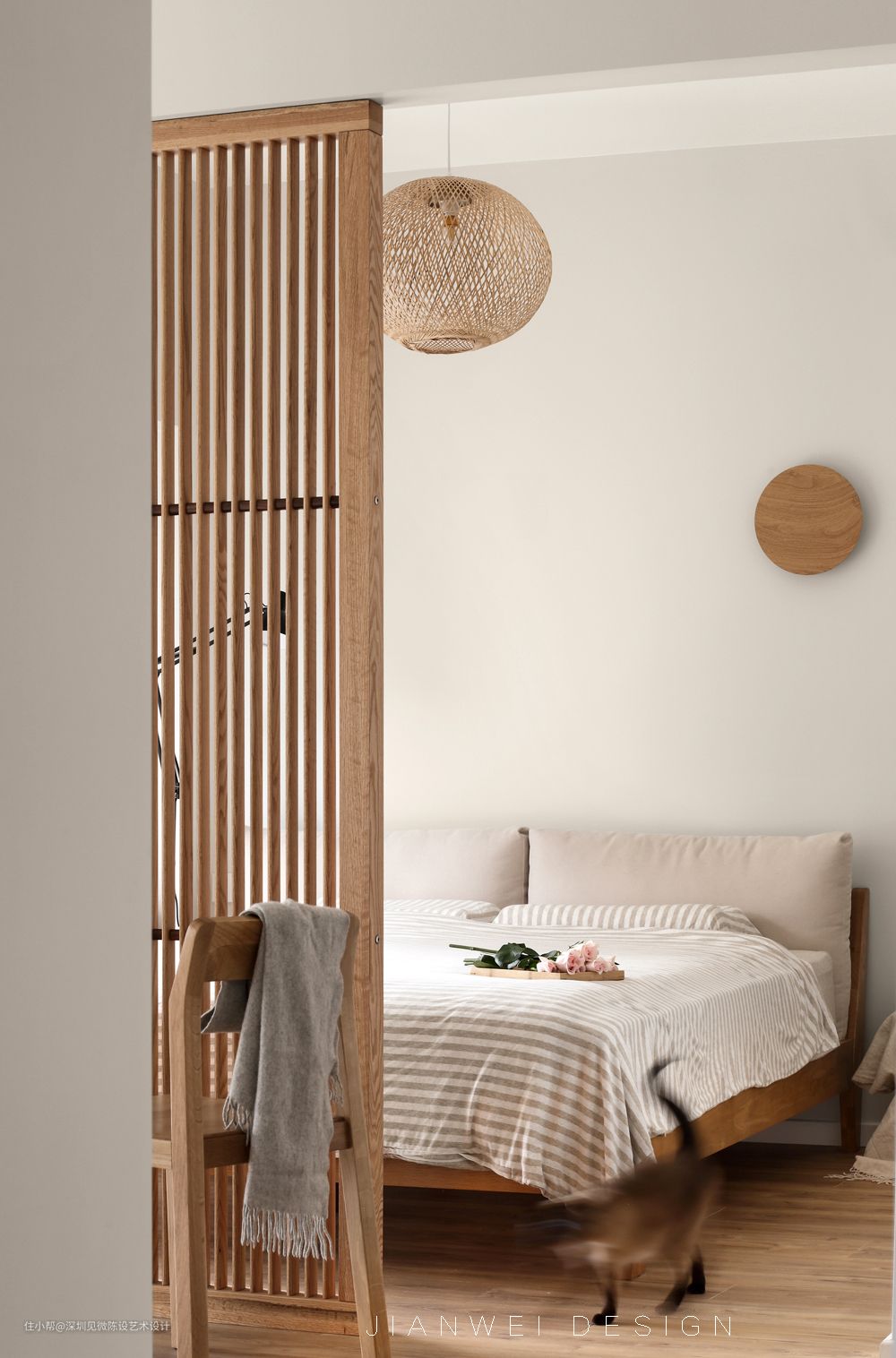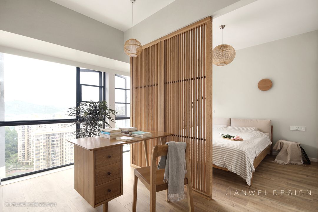 主卧两间房打通,最大化利用空间,集衣帽与卧室于一体,以原木屏风作为隔断,有互动有隔离,提升居住体验跟舒适度。书桌面向落地玻璃,视野开阔明亮。竹篾编制对的吊灯罩与空间风格达成一致,原木色在绿植的映衬下,有种返璞归真的感觉。