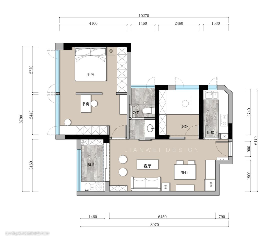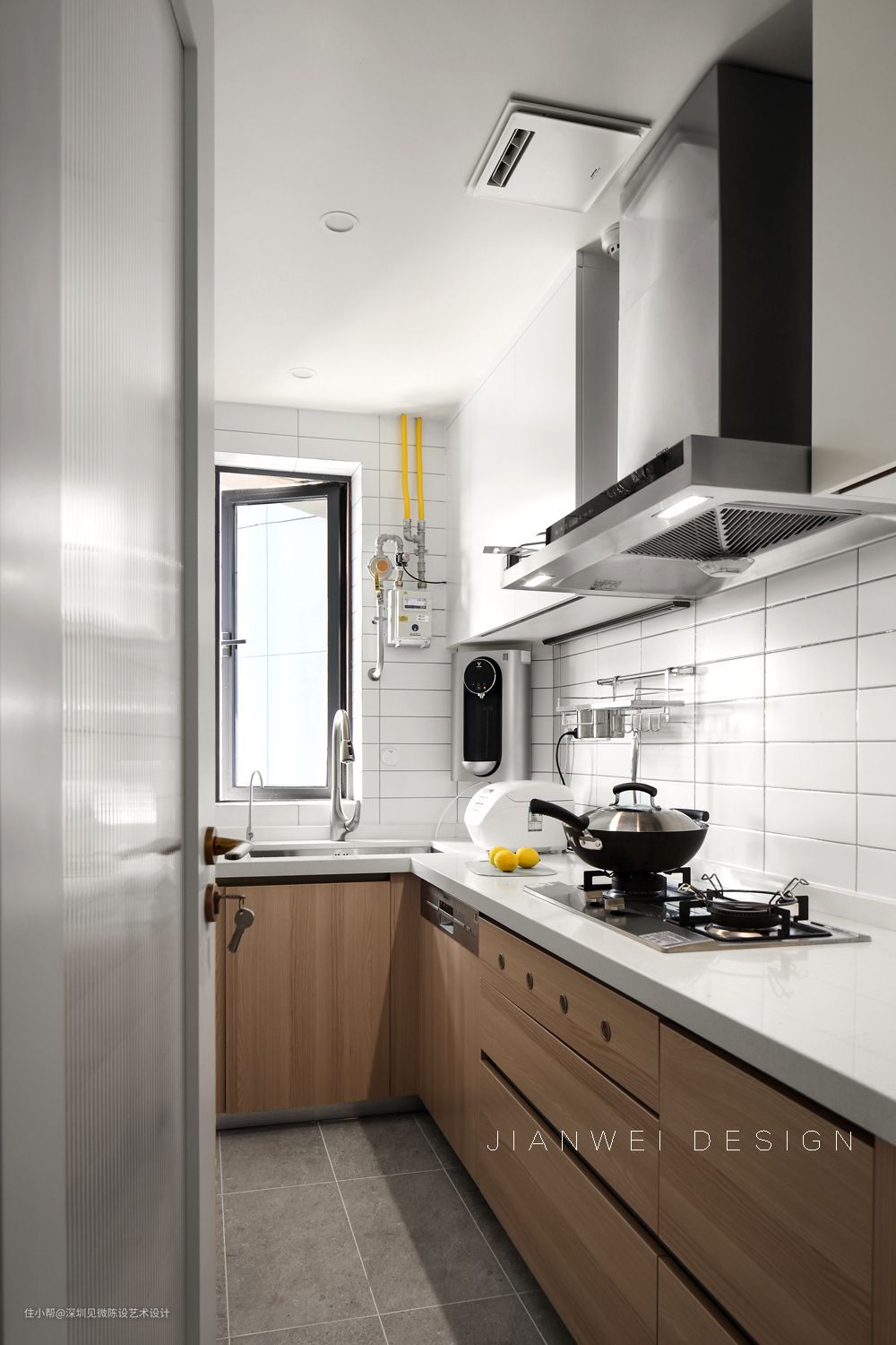 厨房为常规长条形,L型操作台,厨房小物件比较多,尽量简化墙砖,白色会显得空间比较亮堂,也不至于厨房视觉过热。