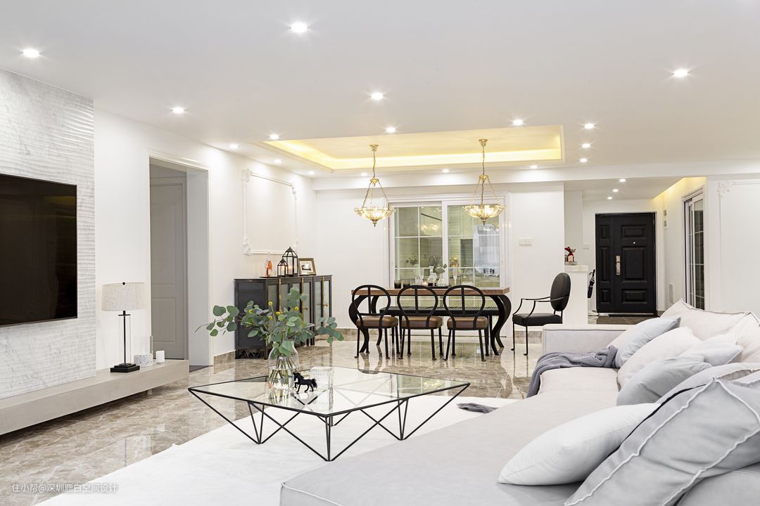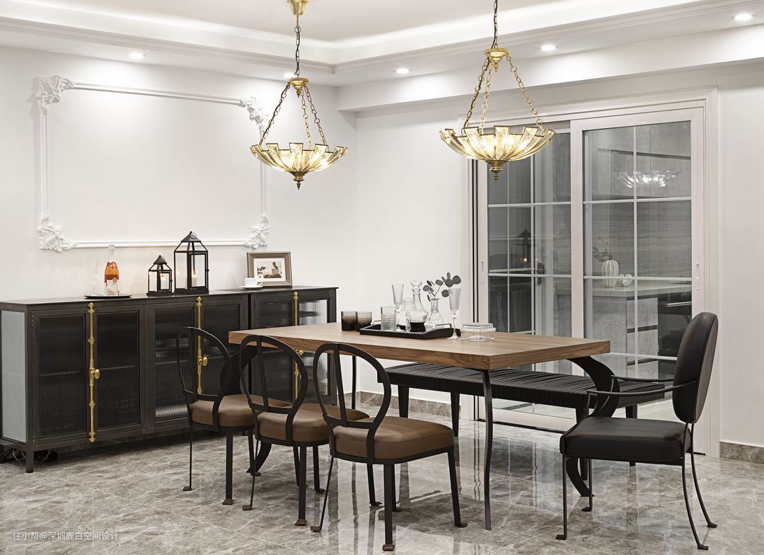 餐厅最有特色的就是 Pu 线条做的雕花背景,搭配上黄铜色吊灯,感觉梦回巴黎了有没有。复古的灯饰,以及餐边柜金色复古拉手,增加空间的年代感,我们主要是希望空间有复古的感觉,所以在一些饰品选择我们会用做旧啊以及玻璃器皿啊,来还原复古风韵。