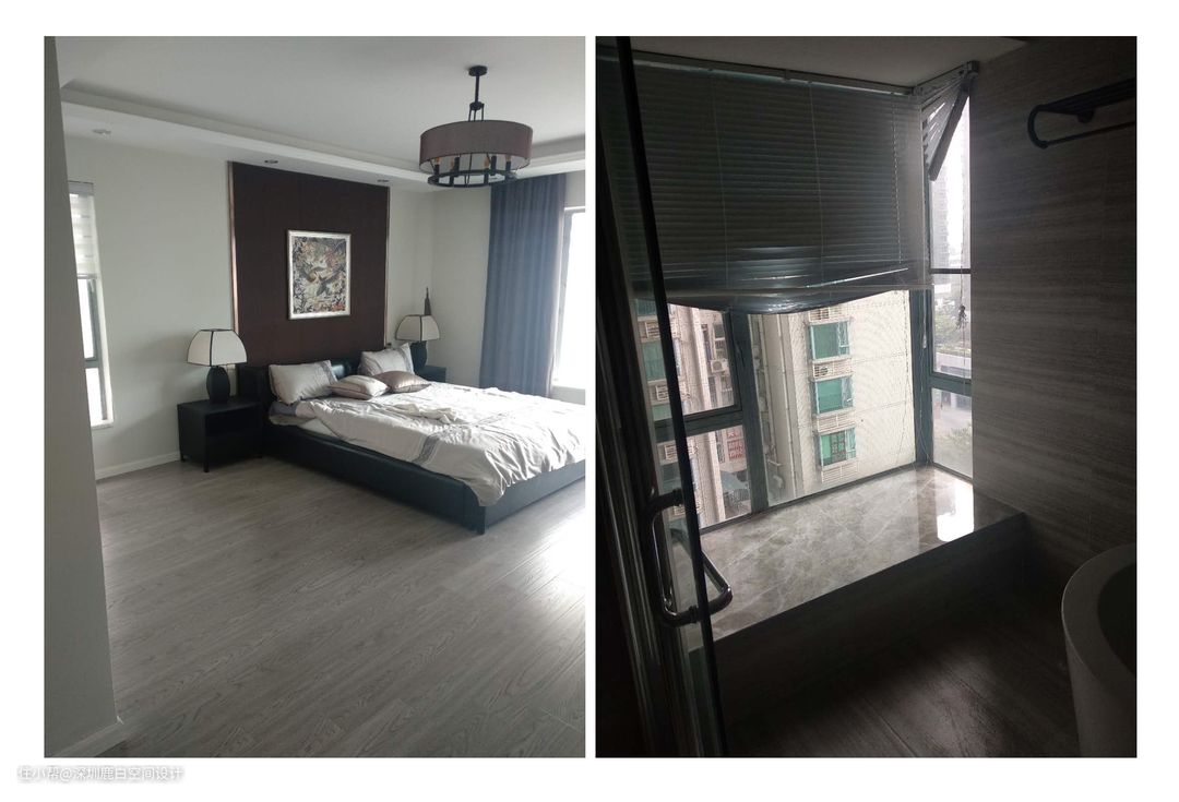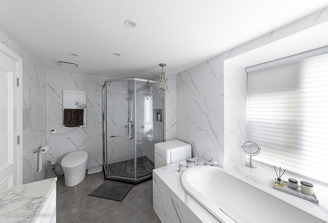 利用卫生间的飘窗台和浴缸连接起来,增大浴缸台面位置,可以泡澡的时候放ipad或者一些水果等,台面足够展示摆放物品,节省洗手台与浴缸过道空间就足够大,马桶位置是固定的,我们就利用角落做了钻石型的淋浴房,合理分布了整个卫生间。