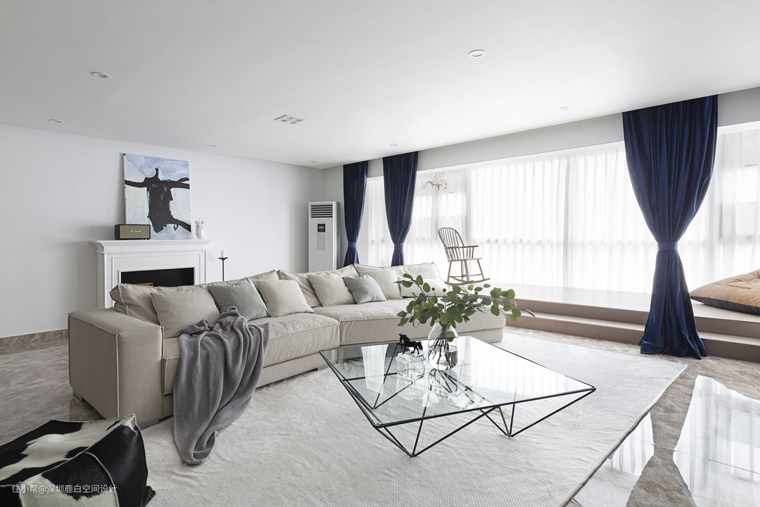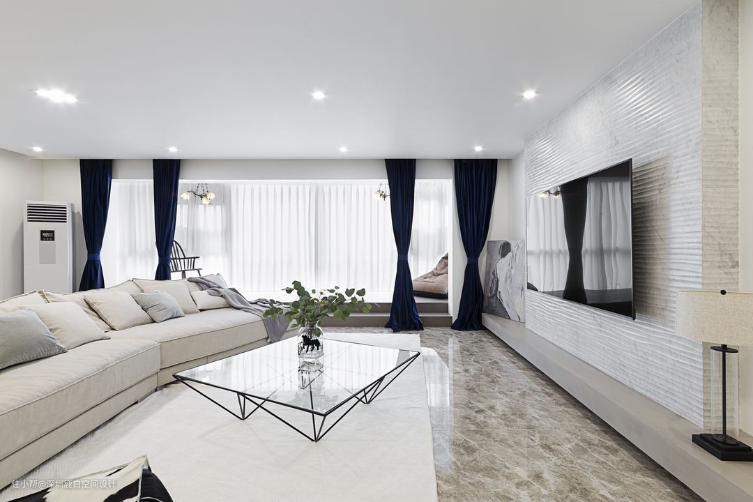 由于客厅尺寸是6.7米*5.2米,我们常规电视与沙发距离最大距离是4.5米,所以让沙发不靠墙,不影响视觉效果,还可以增加沙发背后的过道距离。我们将阳台外推,增加客厅横向空间的视觉效果,做了休闲空间增加地台是很好的区分2个区域。整体空间我们用了冷暖搭配的手法,我们冷色的窗帘与画相呼应,暖色我背景色主体色,冷色为点缀色。使客厅更为丰富。