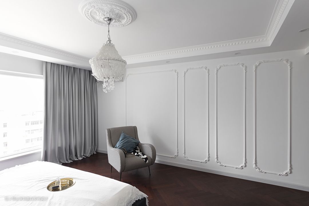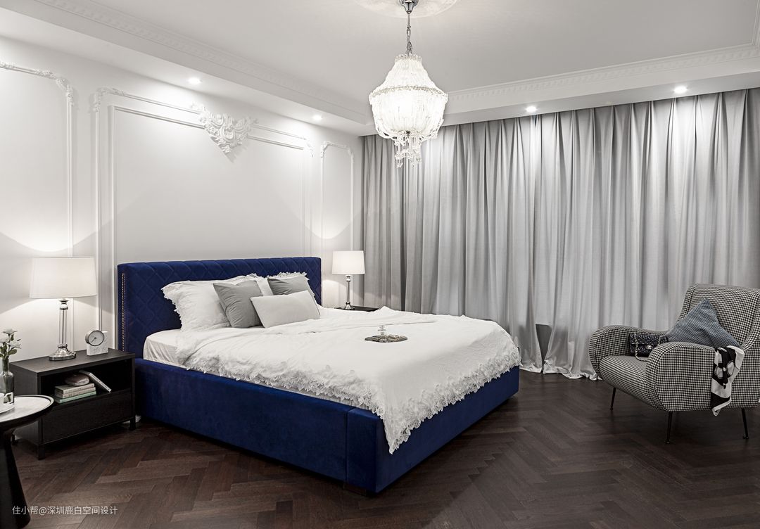 主卧床位放置了一个单人沙发,方便临时搭放,颜色 搭配以暖色做主色调,冷色我点缀色搭配,然后空间有变化,不是一个色系。暗红的质感和人字拼贴的方式很符合我对复古味道的设想。浪漫的蕾丝床品,水晶吊灯,精致的雕花,慢慢的展示我对古典风的喜爱。