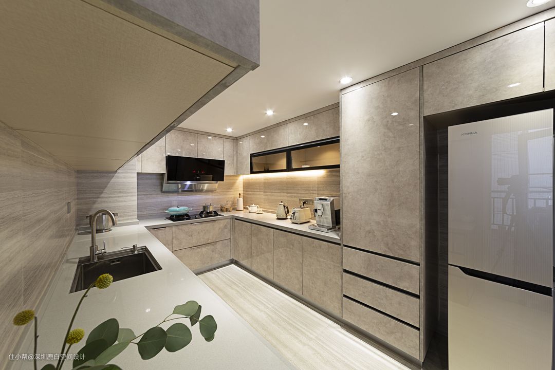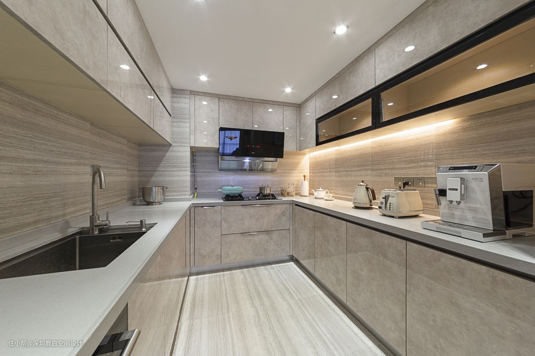 超大的厨房,容纳了我们所以需要的电器,冰箱旁边做了一组高柜,让冰箱空间没有那么单薄、突出,使冰箱整体融到橱柜一体,还可以增加很大的储物空间。上柜做了玻璃展柜更通透,还可以展示很多漂亮的马克杯,或者自己收纳的一些漂亮的厨房用具,如果全部柜门就太死板了。我们在吊柜下方增加灯带是方便操作,打亮操作台面。是个不错的选择呢。