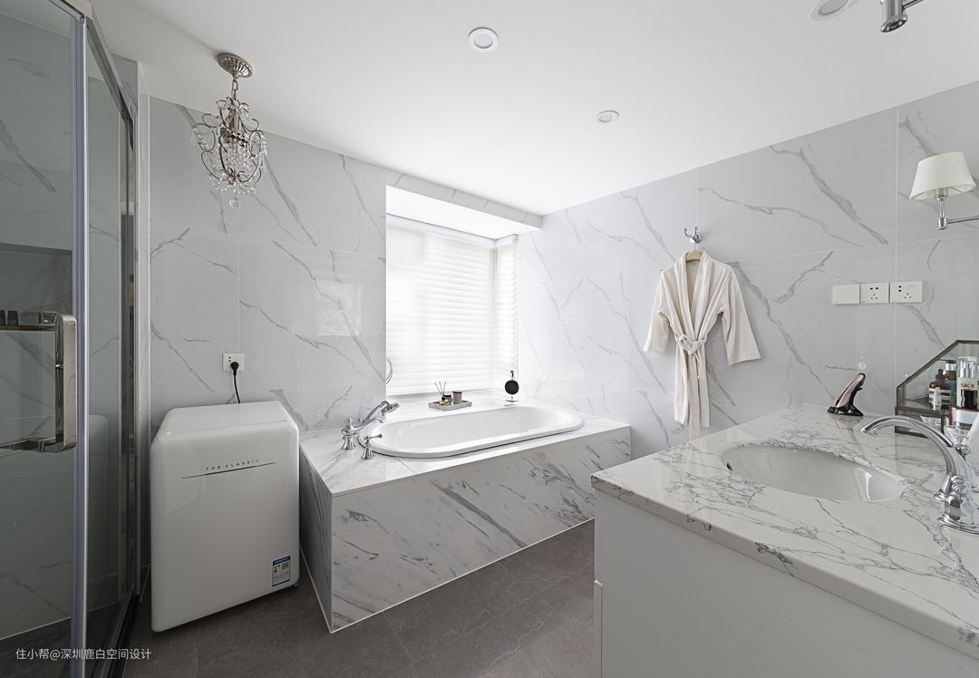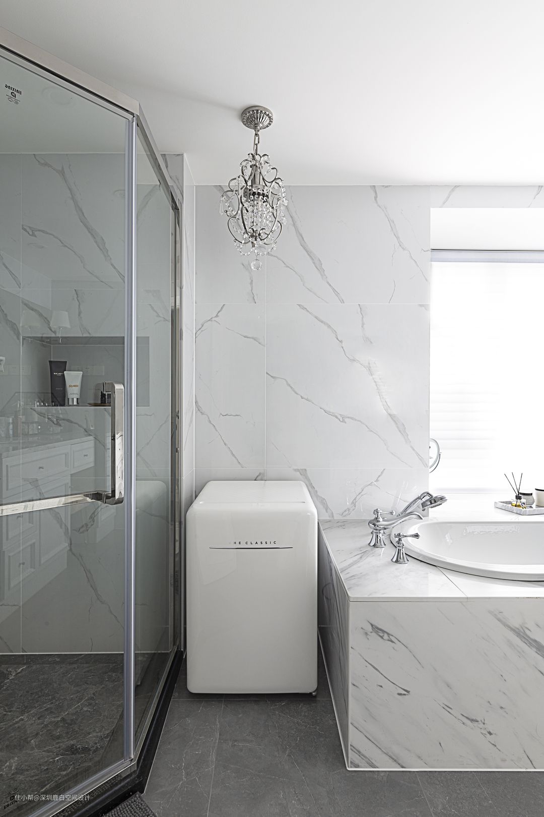 利用卫生间的飘窗台和浴缸连接起来,增大浴缸台面位置,可以泡澡的时候放ipad或者一些水果等,台面足够展示摆放物品,节省洗手台与浴缸过道空间就足够大,马桶位置是固定的,我们就利用角落做了钻石型的淋浴房,合理分布了整个卫生间。