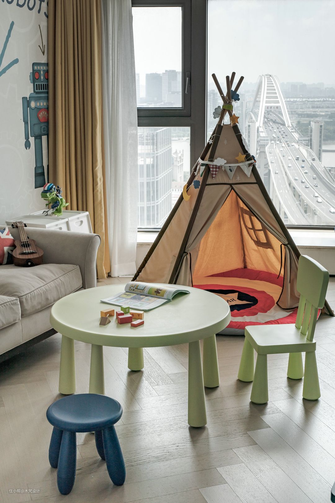 3、二楼休闲区是集瑜伽室,儿童玩乐区,男主的游戏区的多功能区域,并且把旧物利用做到了极致。除此之外,轻薄通透的楼梯设计也是本案的一大亮点和难点,后来成为了很多客户的重要参考!请耐心往下看,每个空间都有亮点!