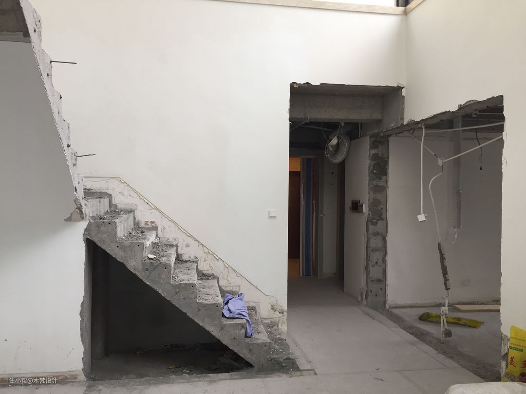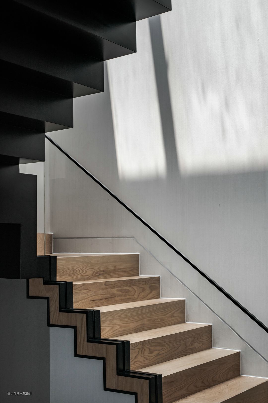 我们把原来现浇的L型楼梯敲除改成U型,使楼梯显得更加轻薄,悬空的设计让整个空间更为通透。所有踏步都是45度角拼接,与墙无缝衔接,钛合金的包边,使玻璃护栏和原木踏步更加精致。