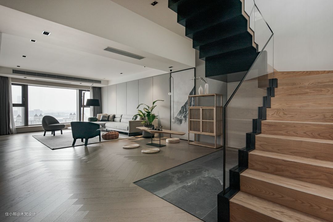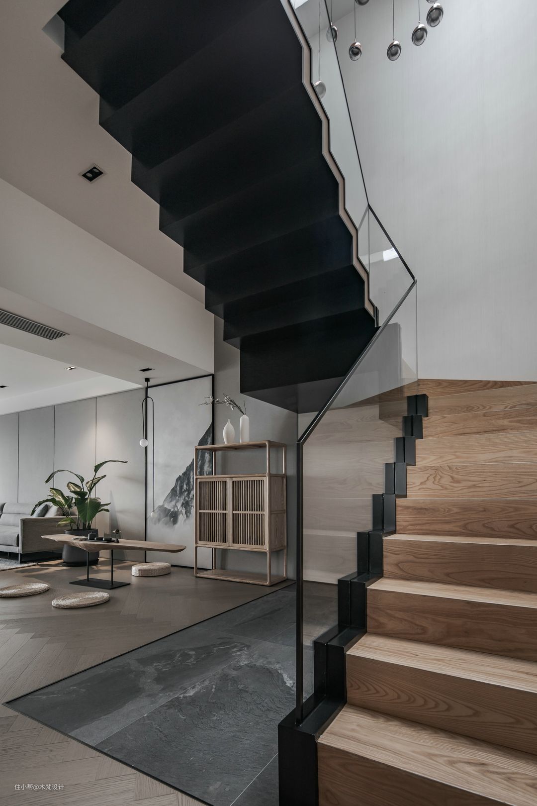 楼梯是本案的亮点和难点,整体采用了钢结构、实木板、不锈钢和玻璃等多种材质,复杂的工艺使美观与实用达到了平衡。
