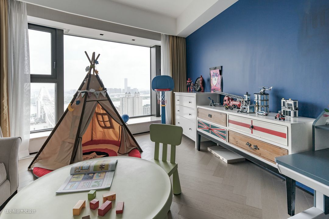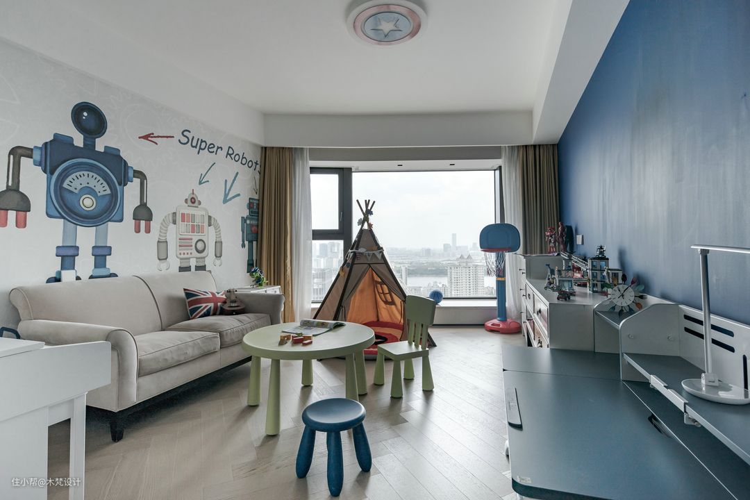 儿童房以海洋蓝为主色调,活力十足又不觉幼稚,定制的机器人壁纸,充满童趣。没有固定的家具,留出足够的空间来跟随孩子年龄的成长灵活调整。一整面蓝色黑板漆既可以让孩子发挥想象进行涂鸦,也可以用来辅导孩子功课。从旧家搬过来的储物柜可以装下孩子所有的玩具,极大的分担了客厅的收纳。