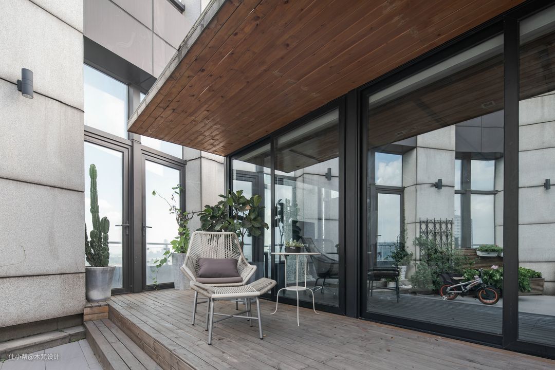 我们用钢结构和木板打造遮阳篷,来解决顶层玻璃房的隔热问题。休闲的藤椅茶几,大型的绿色植物,仿佛把大自然的美景搬到家里,带来放松惬意的度假感受