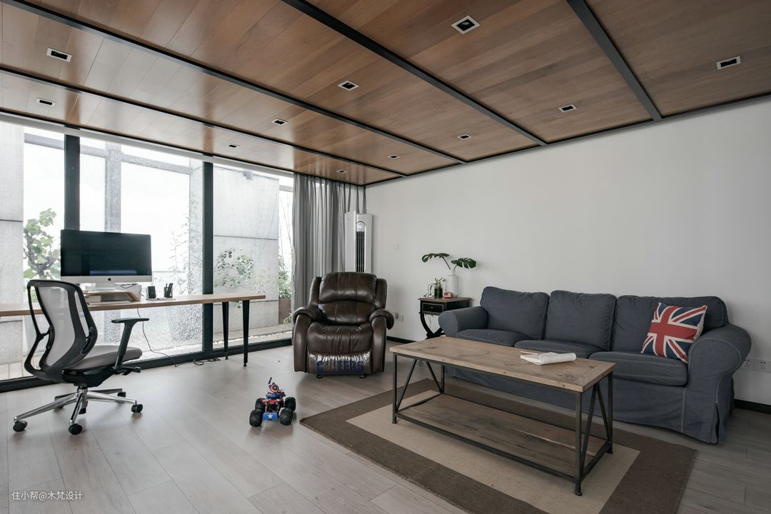 落地玻璃墙明亮通透,引景入室,带来轻松舒适的空间氛围,成为不错的家庭休闲区。这个空间放置的都是屋之前的旧家具,我们还利用精装房拆下来的地板做了天花板,旧物利用其实也是设计中一个非常重要的部分,环保又实用。