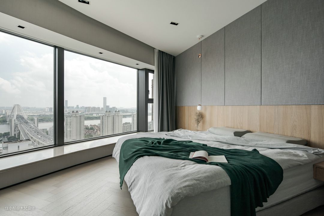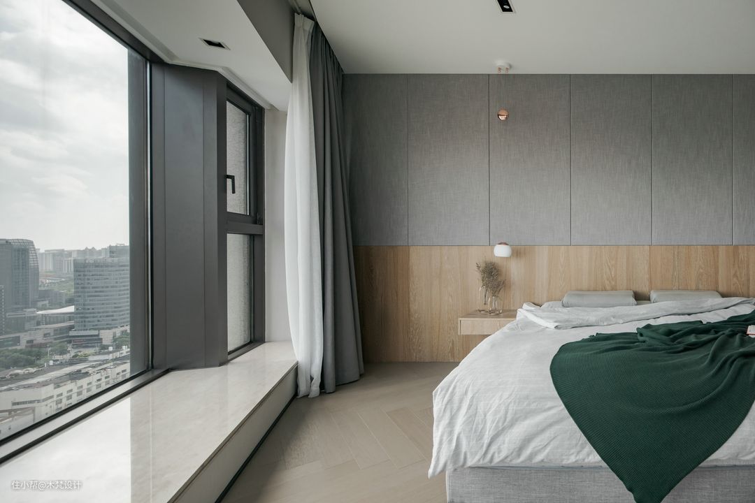 浅木色的护墙板与灰色硬包拼接,柔和的色调让人宁静又安心。无床头的设计,只做了床箱,保留极简的设计风格,整个卧室毫无繁杂。